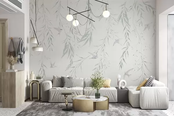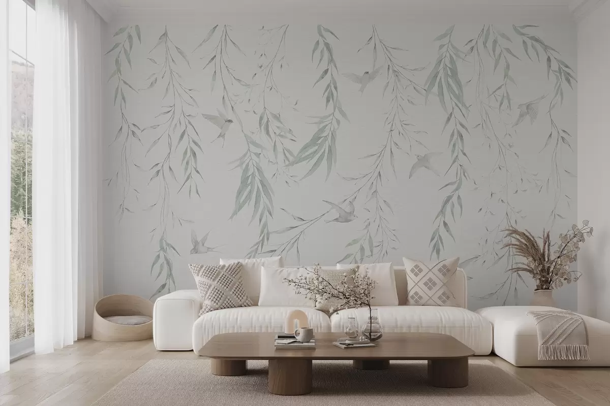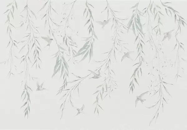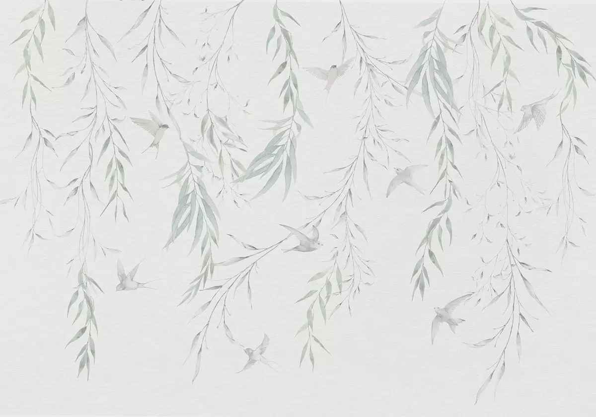 Twigs with green leaves hanging and birds - Wall mural (No. w04052)