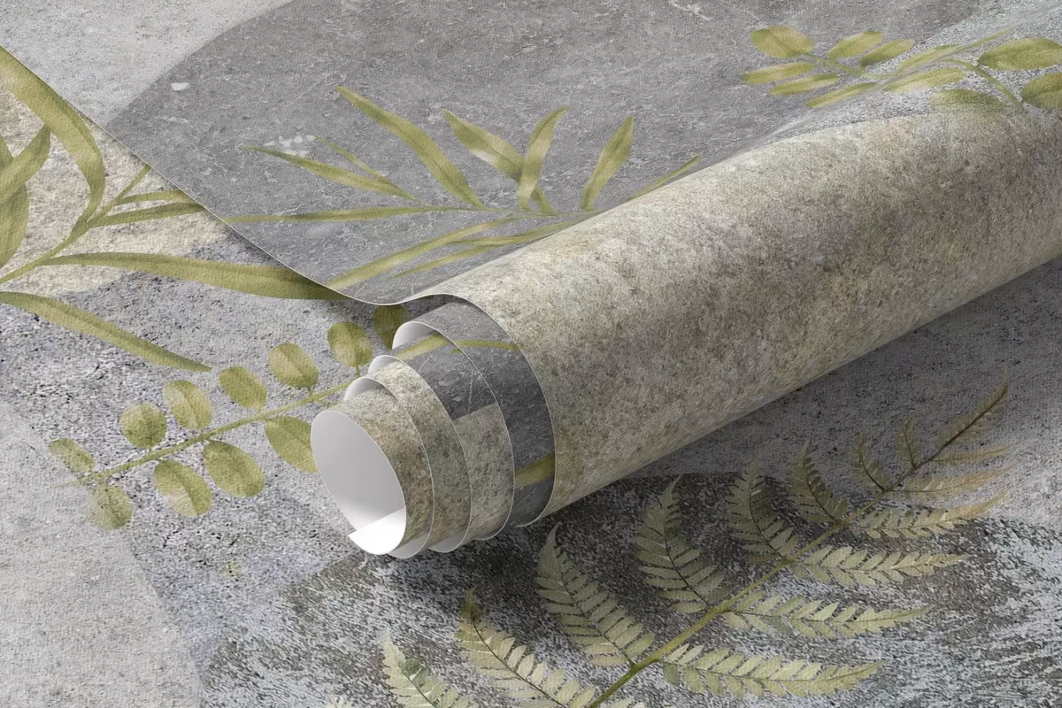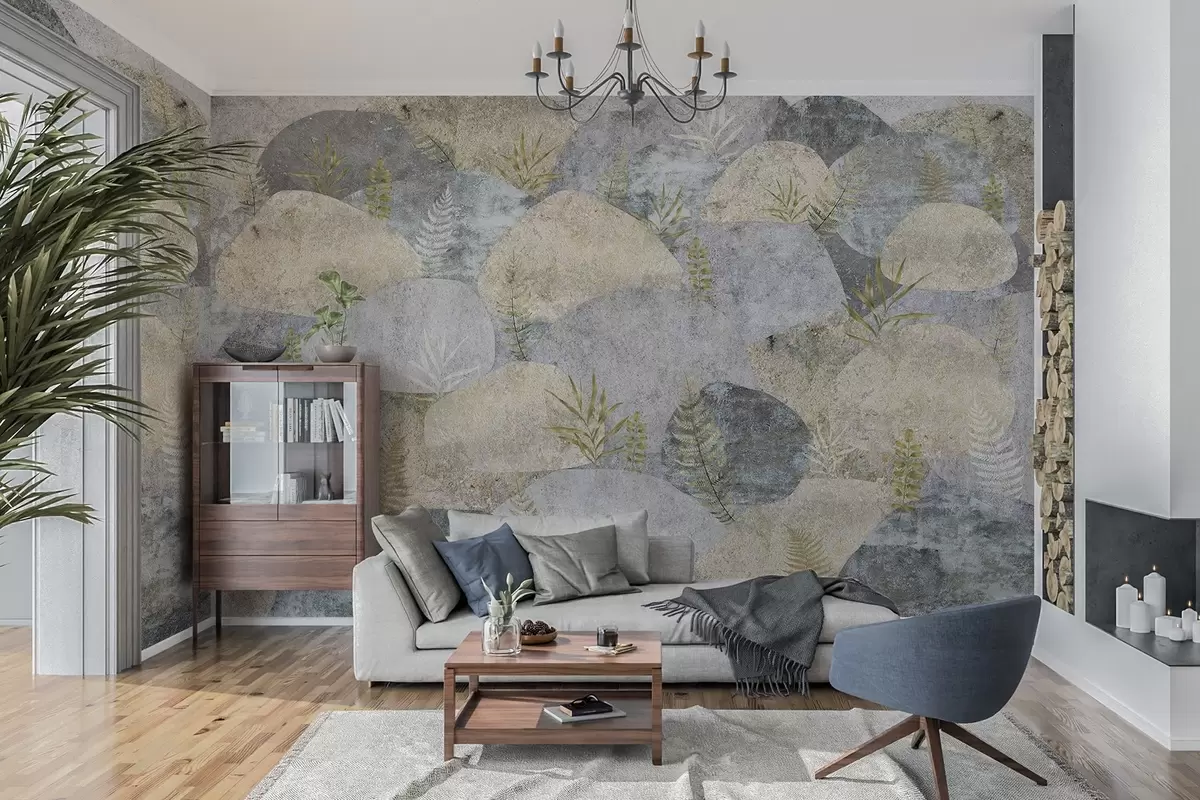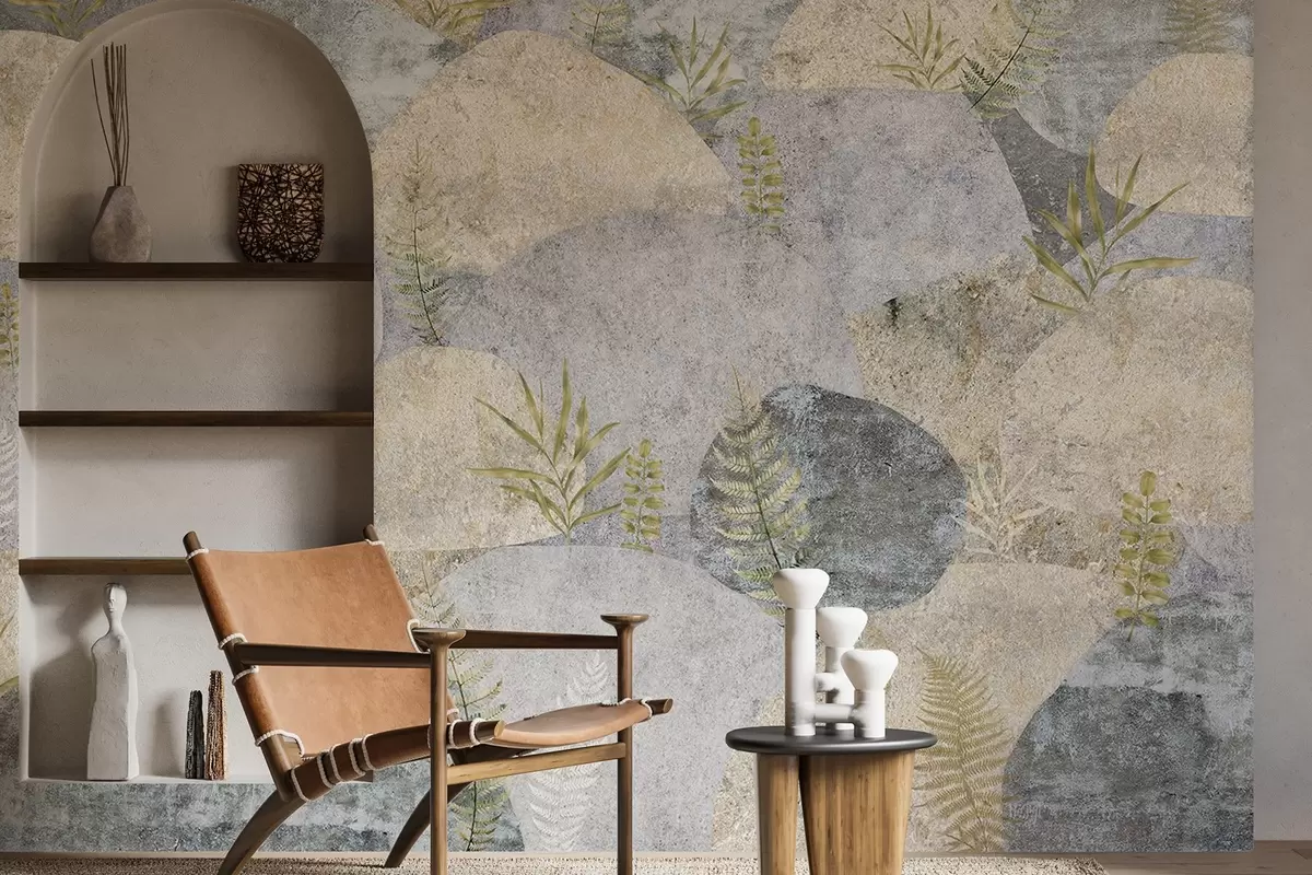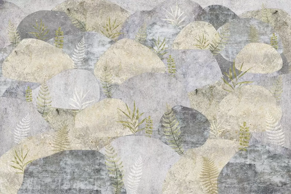 Stones with plants, fern, nordic, rustic style, grey and sand colors - Wall mural (No. w04064)