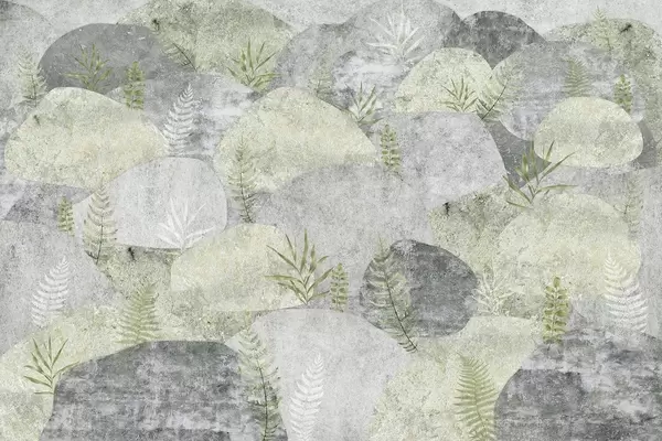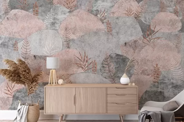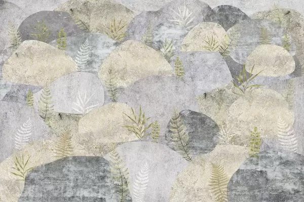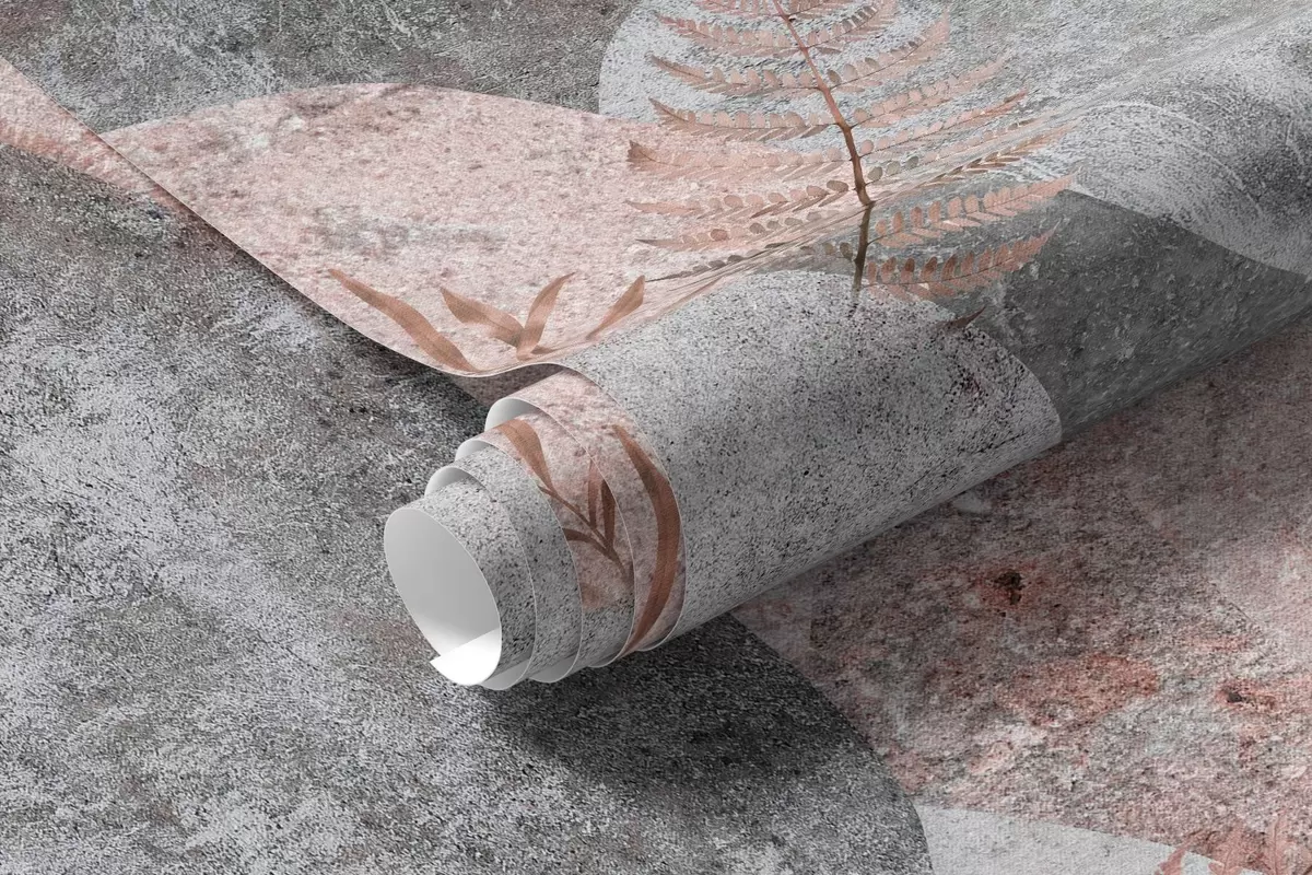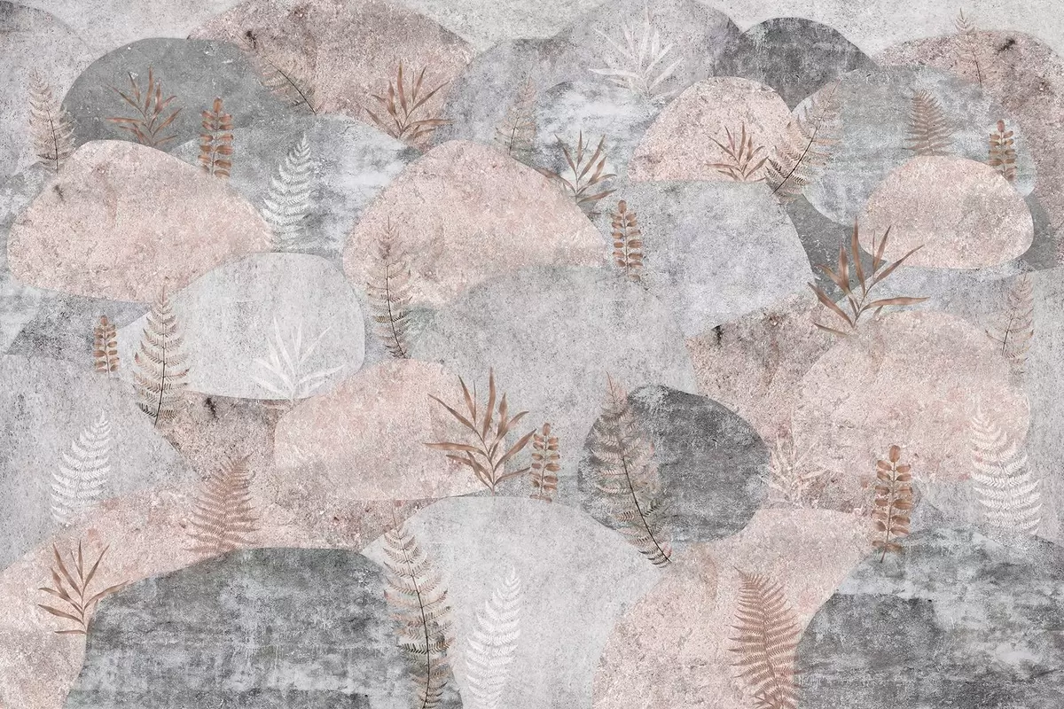 Stones with plants, fern, nordic, rustic style, grey and pink colors - Wall mural (No. w04064v1)