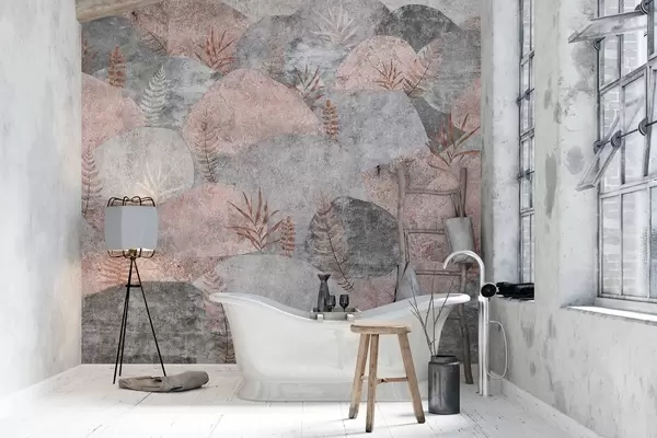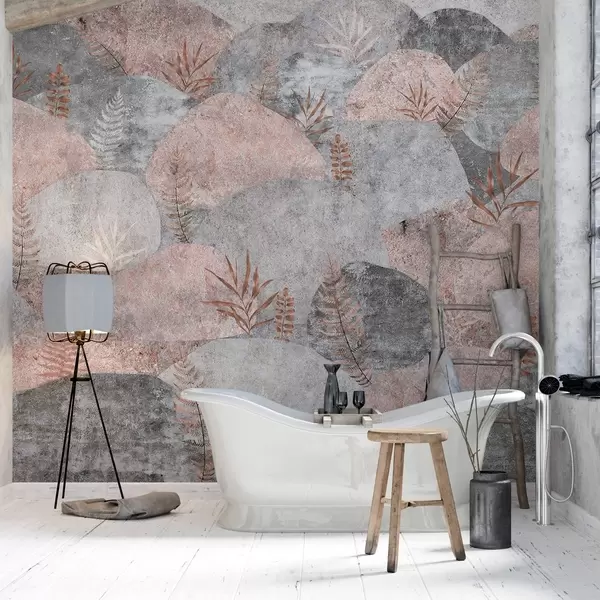 Stones with plants, fern, nordic, rustic style, grey and pink colors - Wall mural (No. w04064v1)