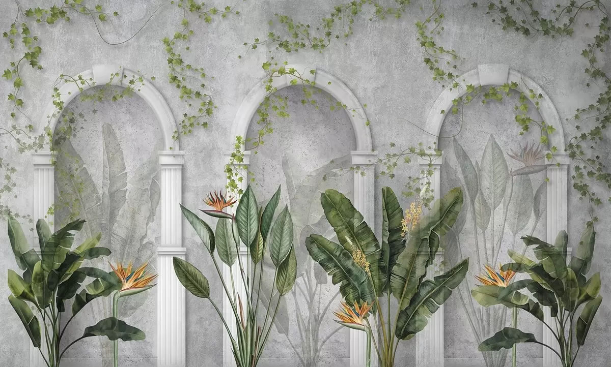 Concrete wall with arches and tropical plants, floral, natural colors - Wall mural (No. w04065)