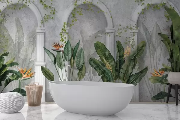 Concrete wall with arches and tropical plants, floral, natural colors - Wall mural (No. w04065)