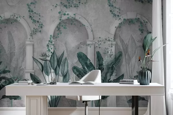 Concrete wall with arches and tropical plants, floral, blue colors - Wall mural (No. w04065v2)