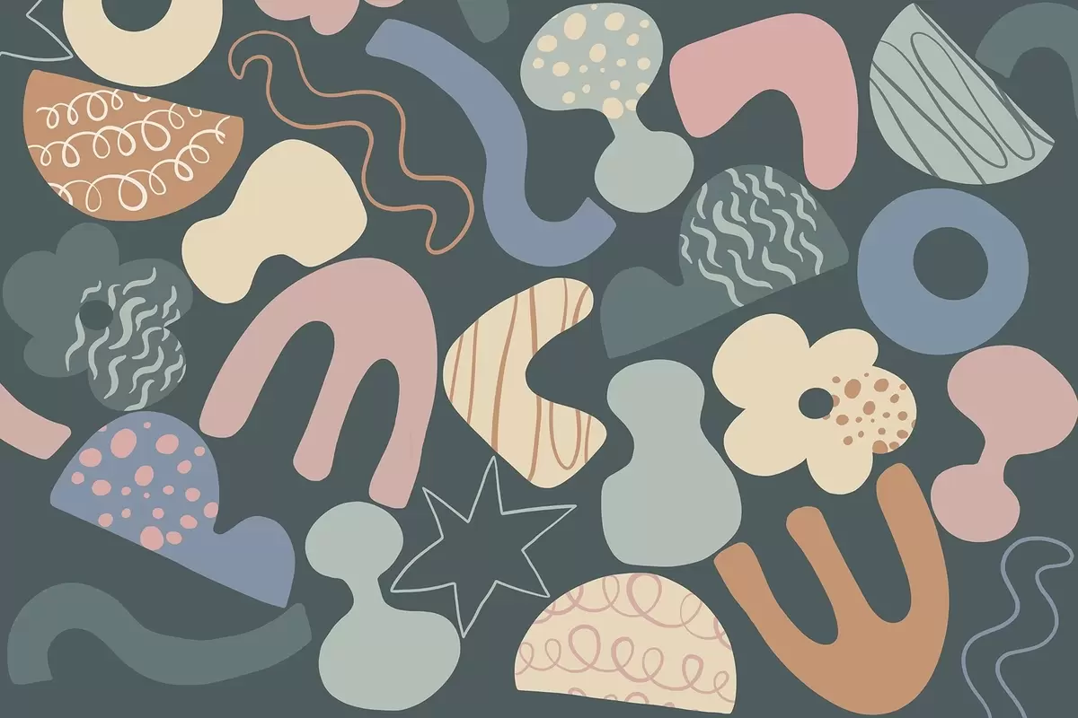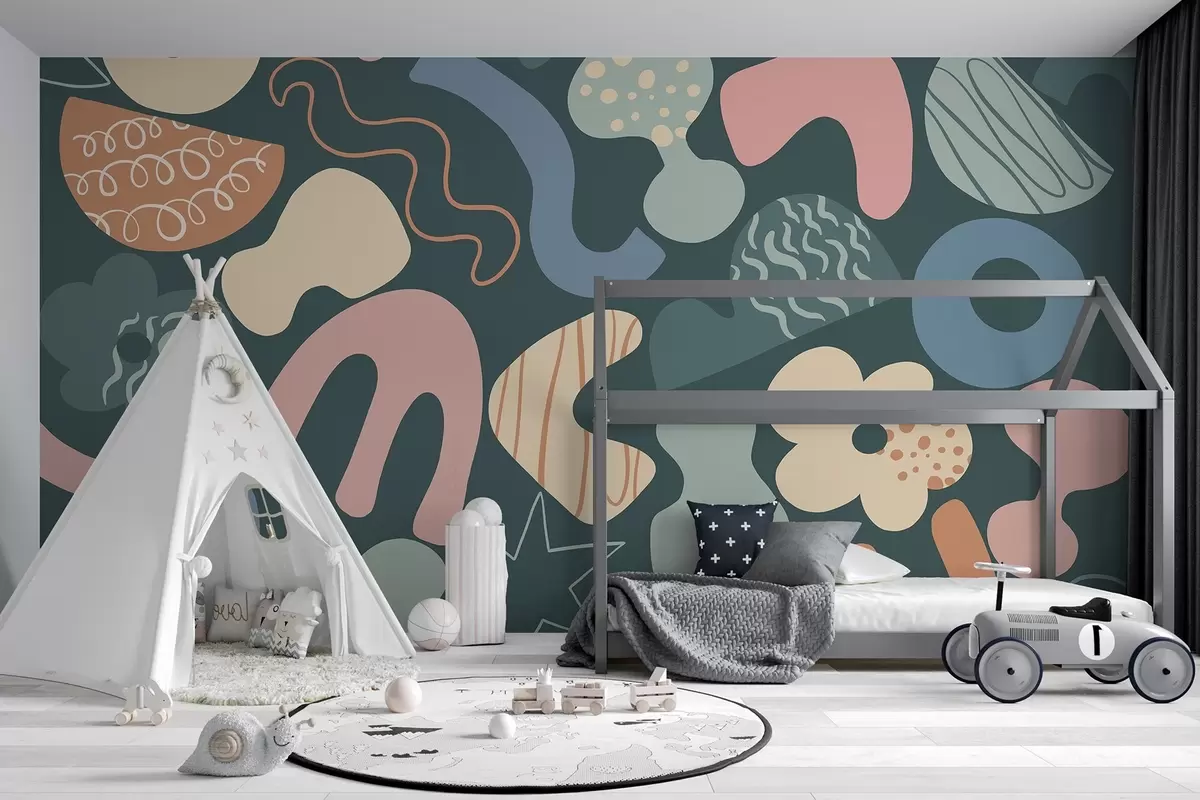 Geometric figures with doodles drawing, juvenile, dark green background - Wall mural (No. w04068v3)