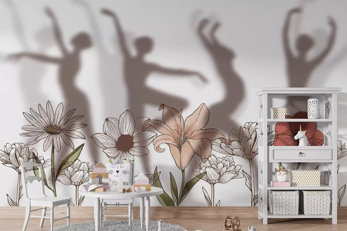 Ballerinas silhouettes, rustic flowers, line art, red and beige colors - Wall mural (No. w04069)