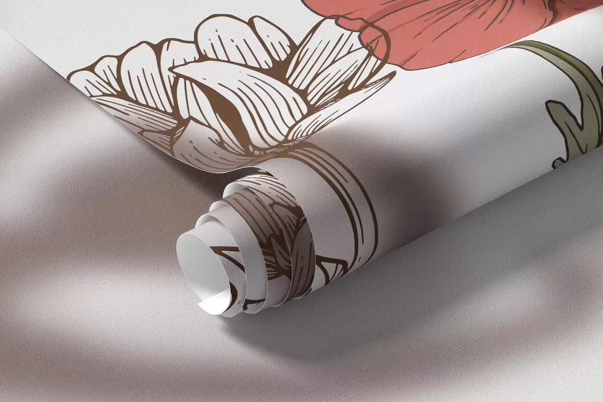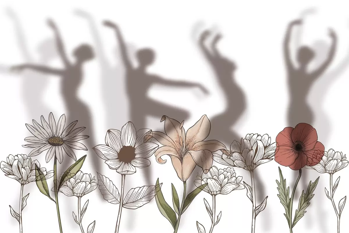 Ballerinas silhouettes, rustic flowers, line art, red and beige colors - Wall mural (No. w04069)