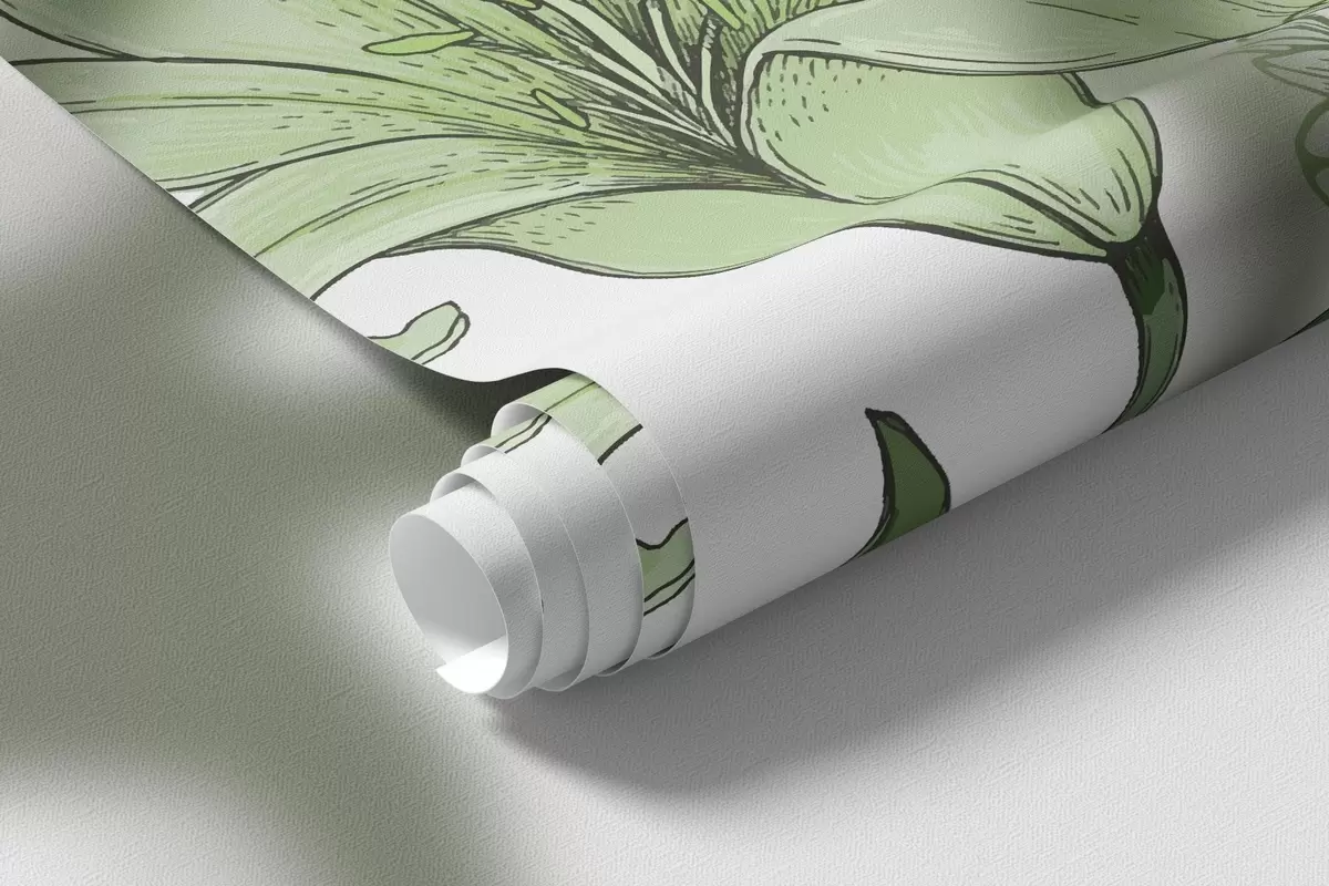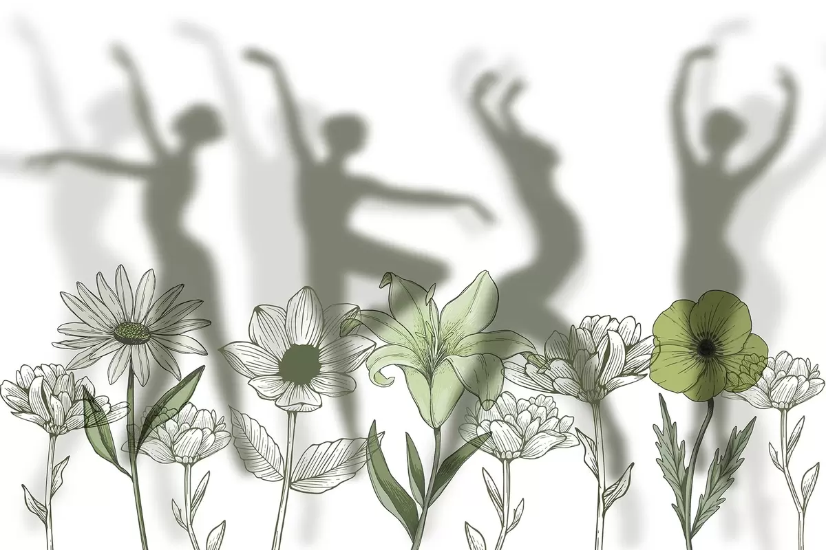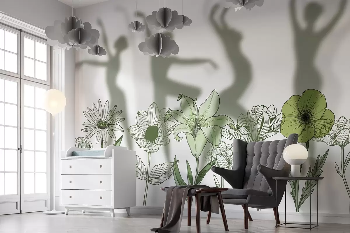 Ballerinas silhouettes, rustic flowers, line art, green colors - Wall mural (No. w04069v1)