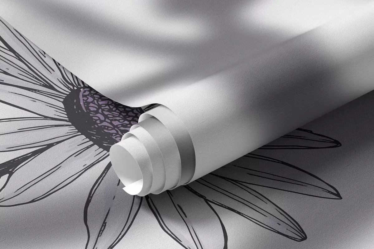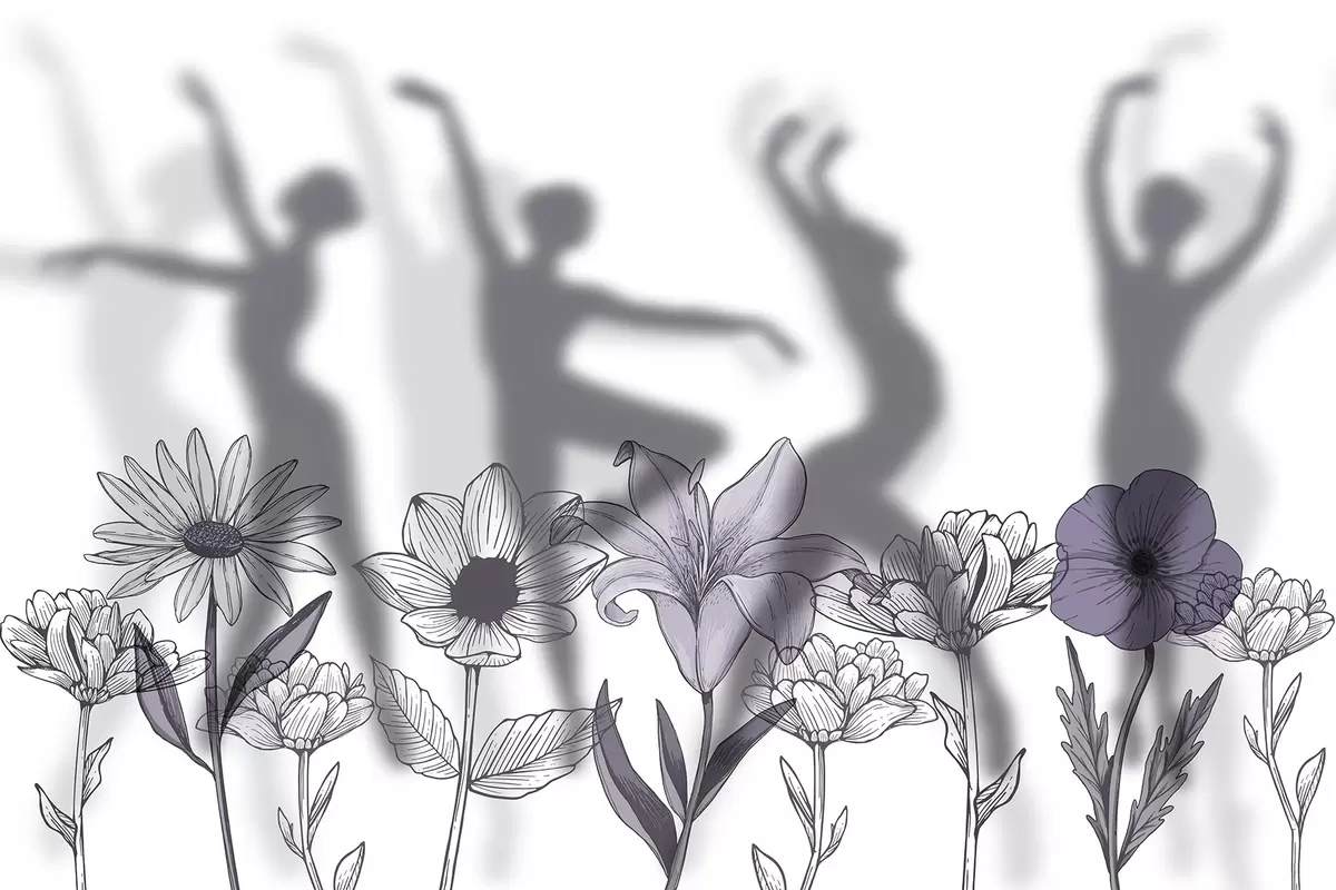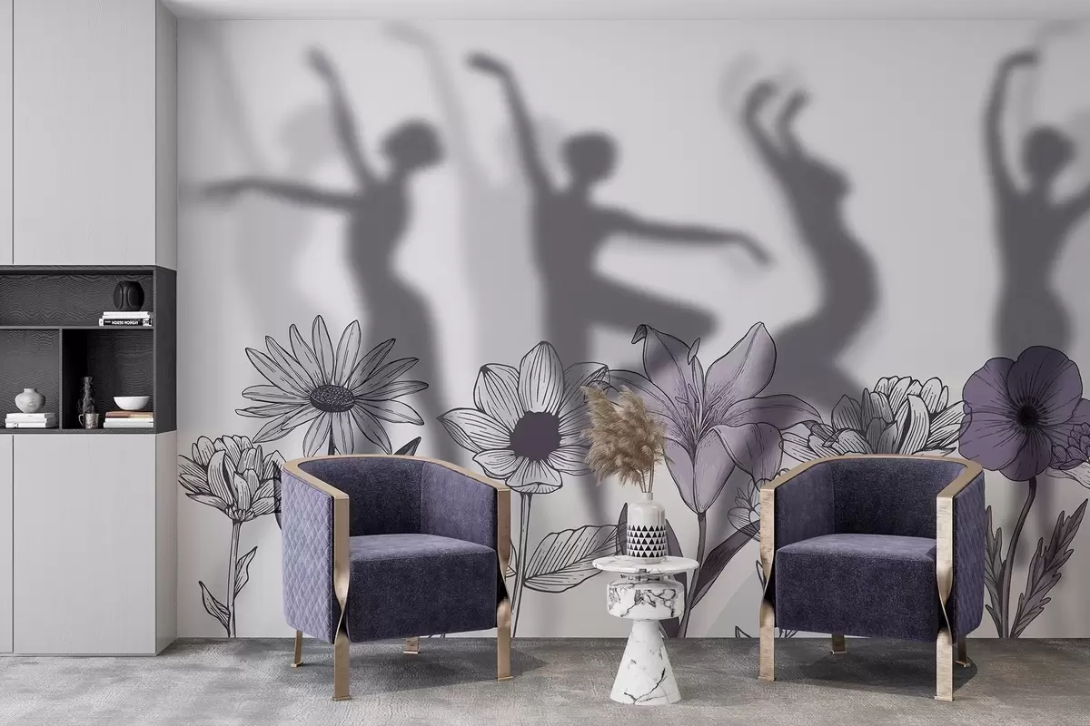 Ballerinas silhouettes, rustic flowers, line art, grey and purple colors - Wall mural (No. w04069v2)