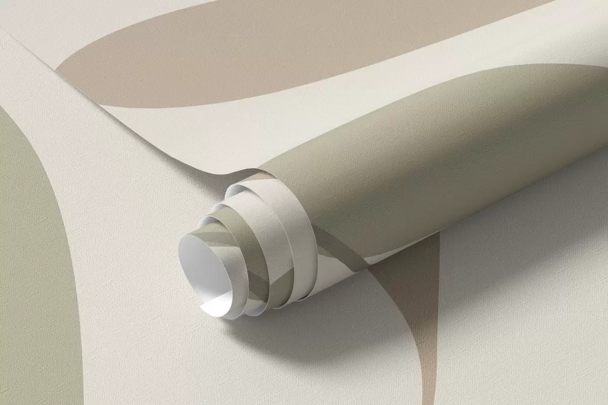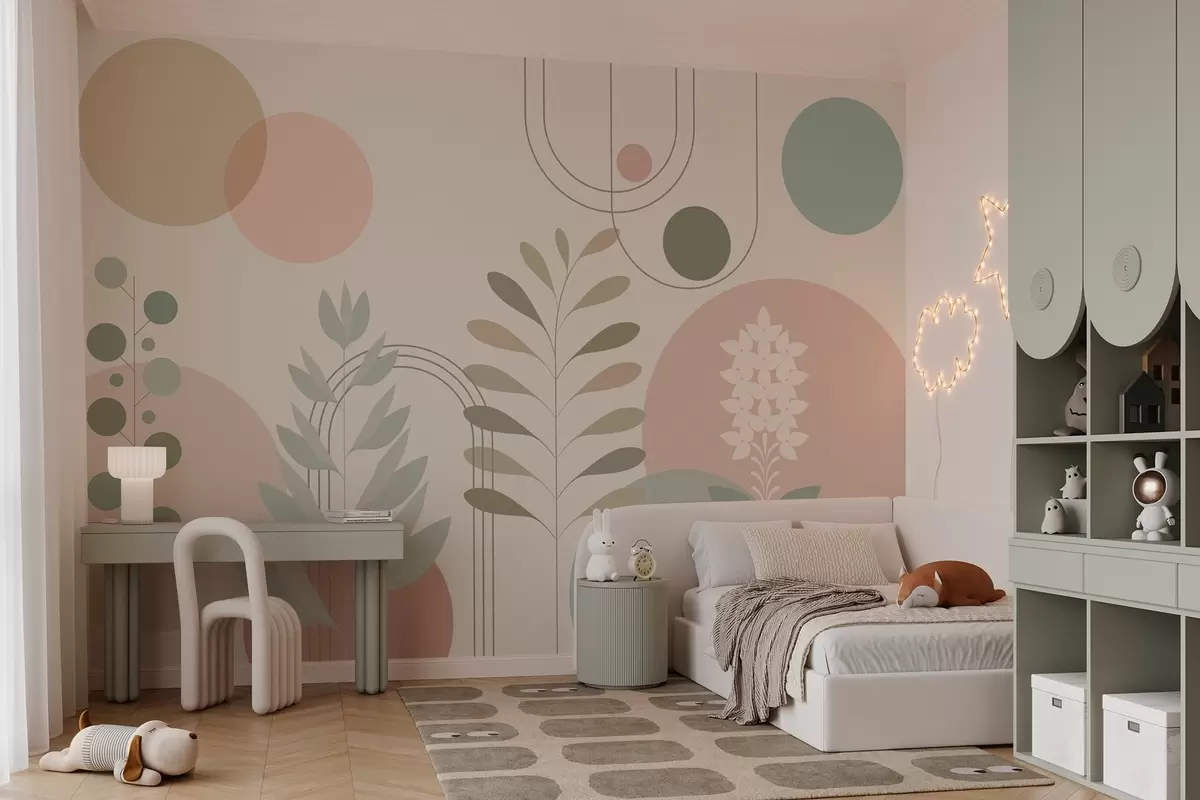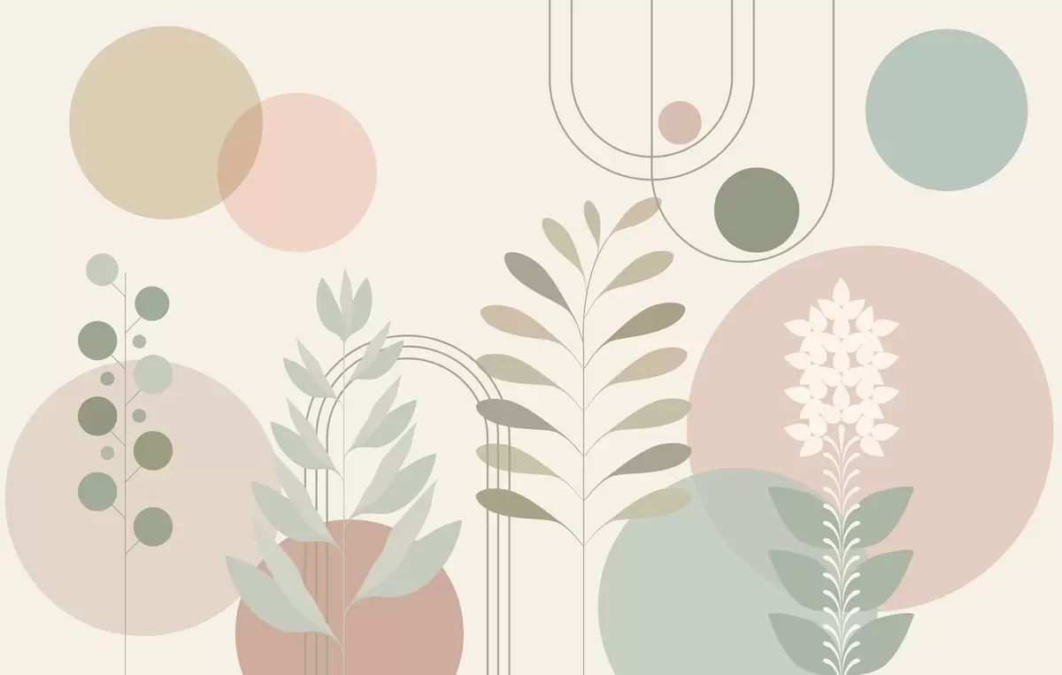 geometric abstraction with circles and stylized plants on a cream background - Wall mural (No. w04070)