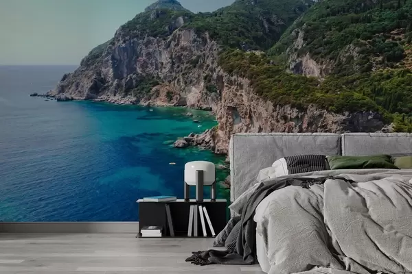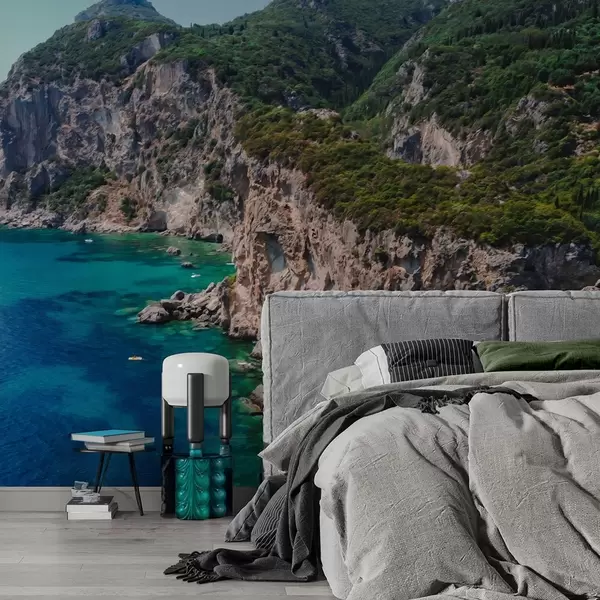 Rock mountains near the sea, oil style drawing, aquamarine water - Wall mural (No. w04096)