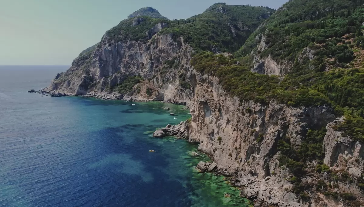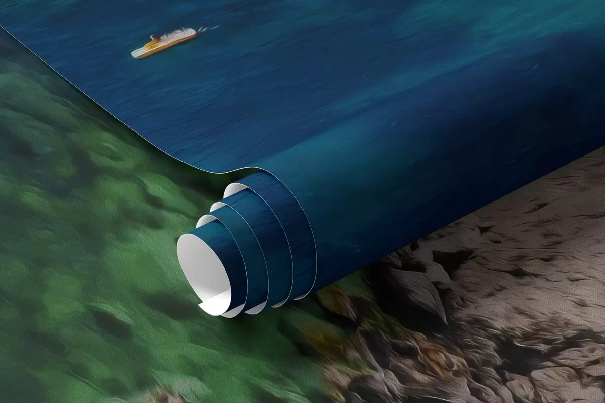 Rock mountains near the sea, oil style drawing, aquamarine water - Wall mural (No. w04096)