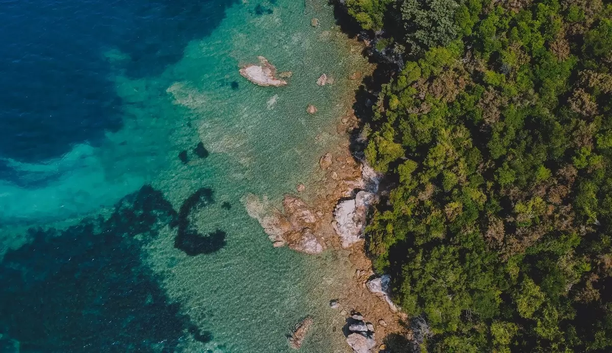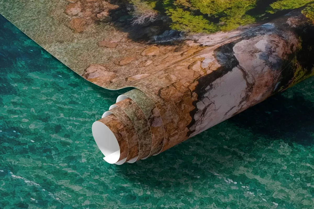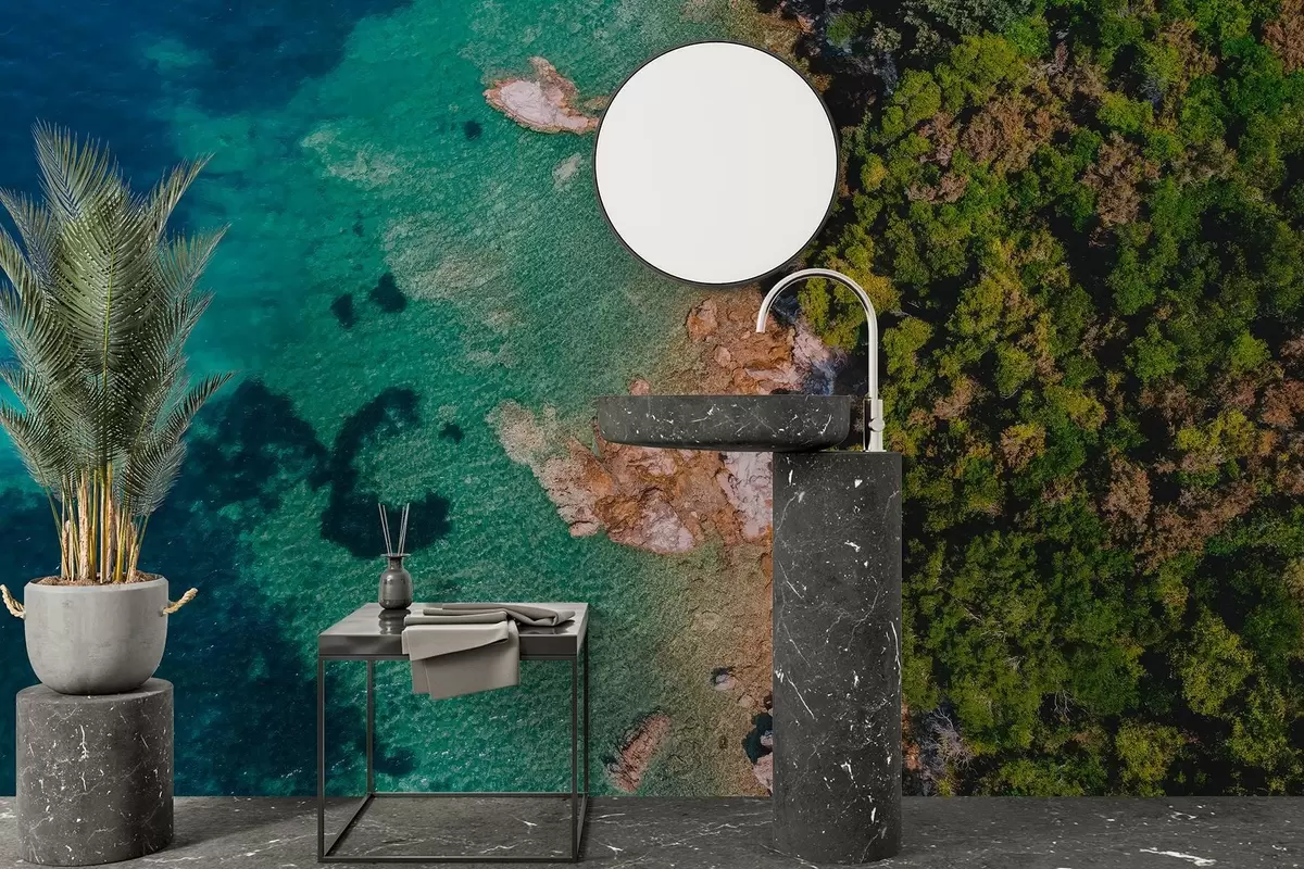 Spain sea coast with aqumarine water, pine forest, air photography - Wall mural (No. w04099)