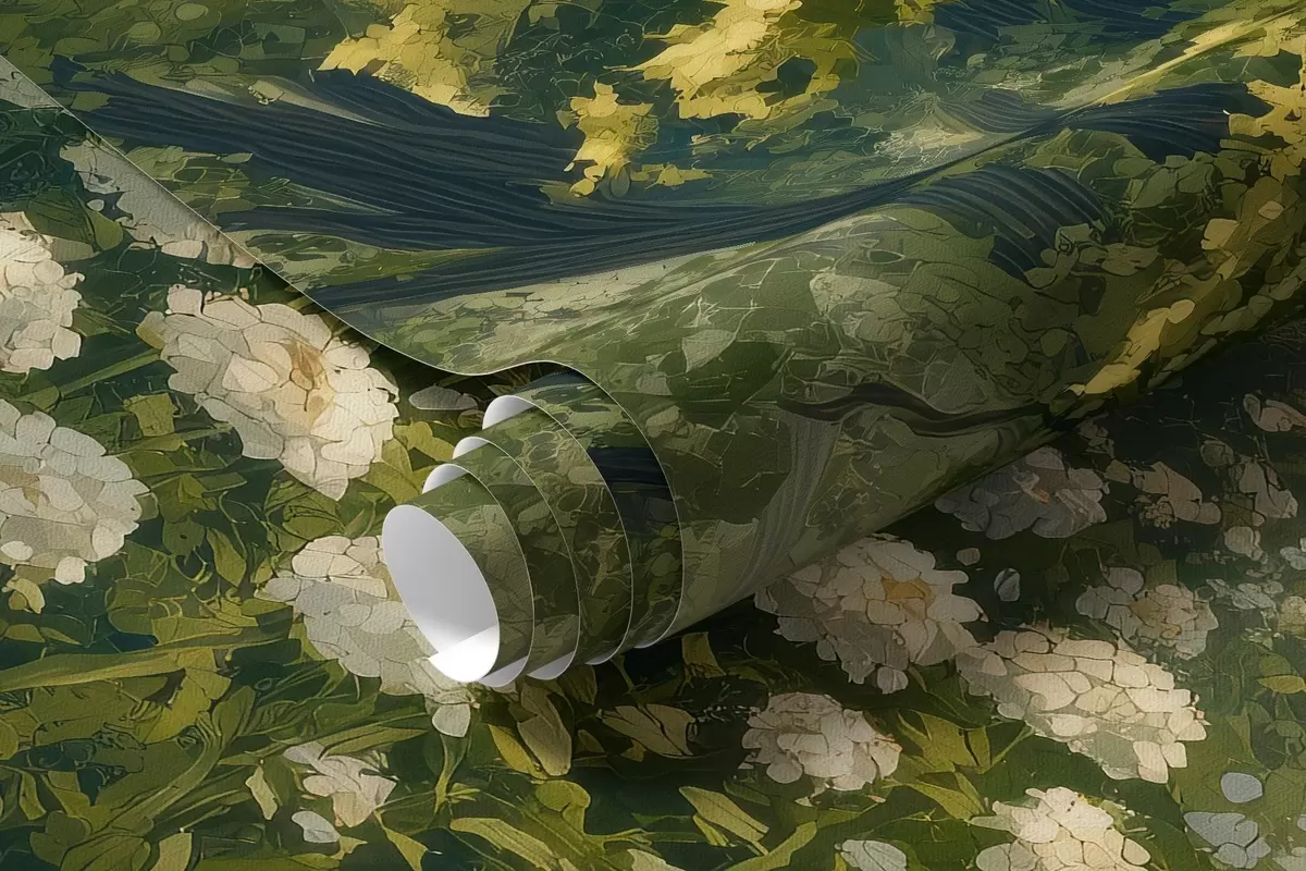 Path in the green forest, white flowers, sunlight, acrylic style drawing - Wall mural (No. w04119)