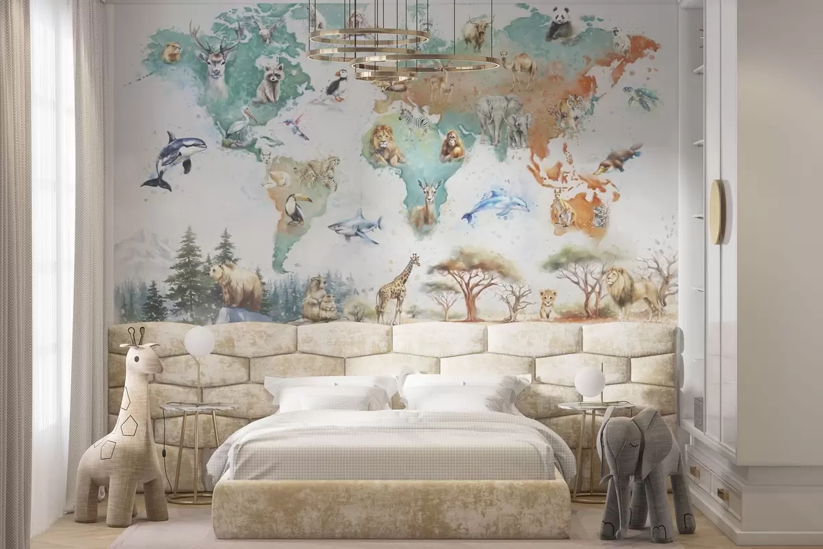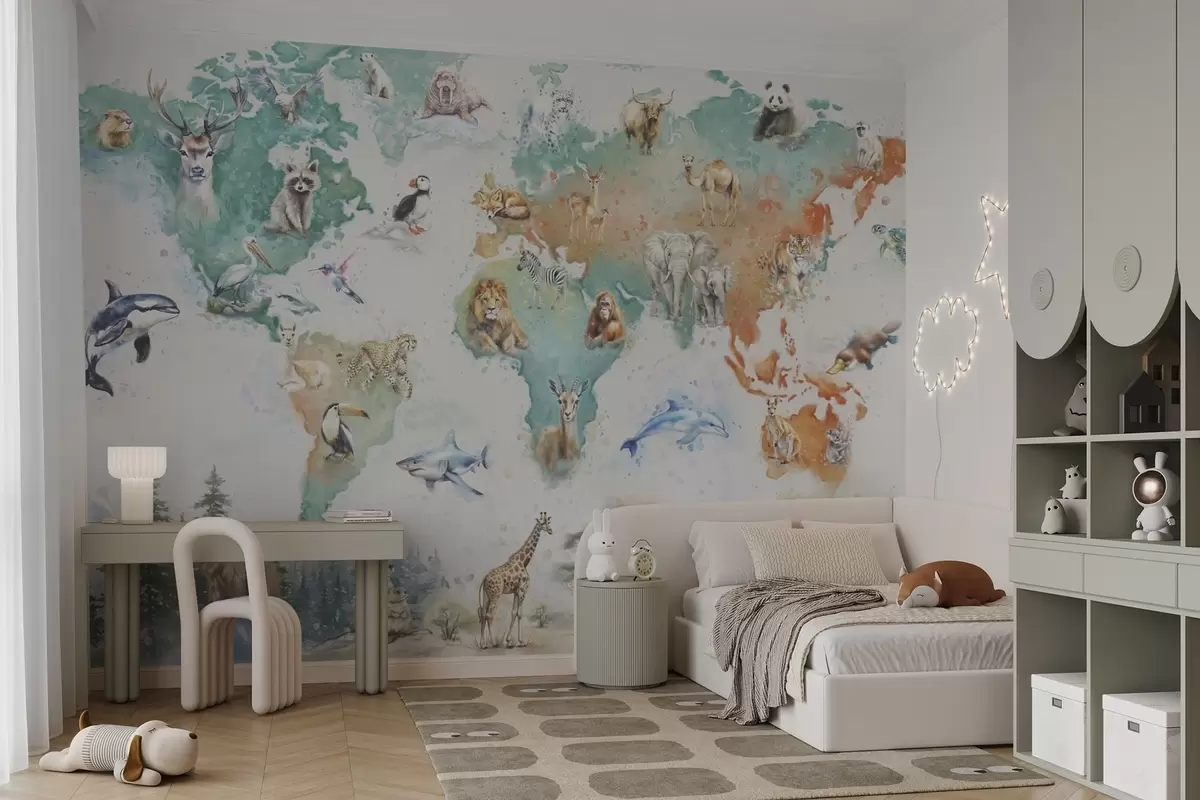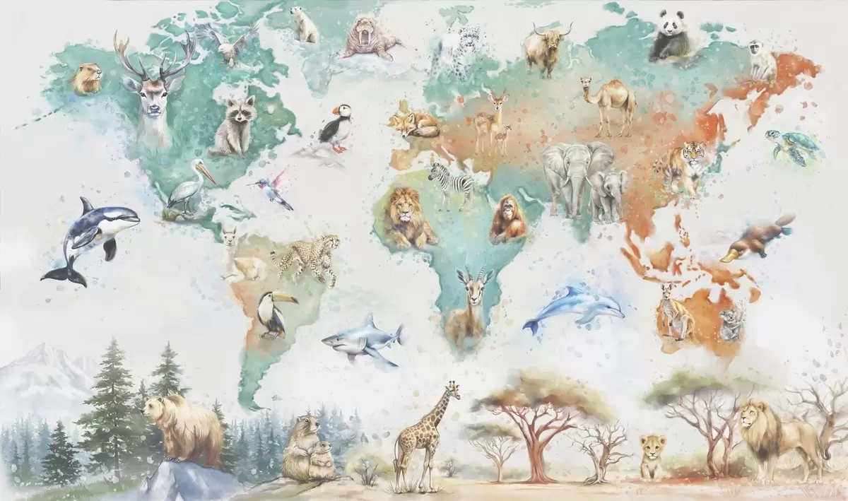 World map with animals, children's educational illustration style - Wall mural (No. w04148)