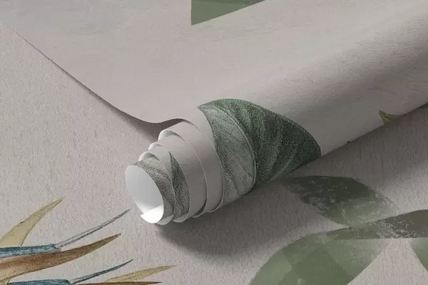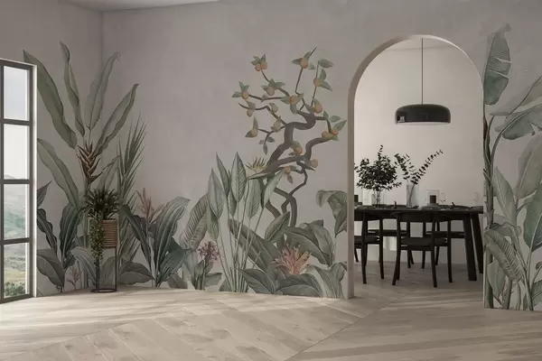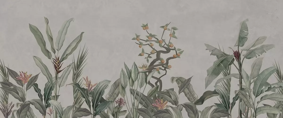 Tropical composition with plants and tree on a grayish background - Wall mural (No. w04201v1)