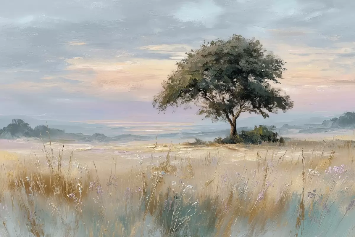 tree in the middle of a field in the style of oil painting - Wall mural (No. w04206)