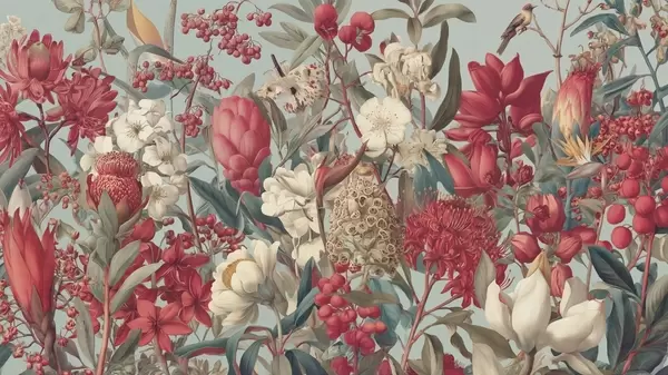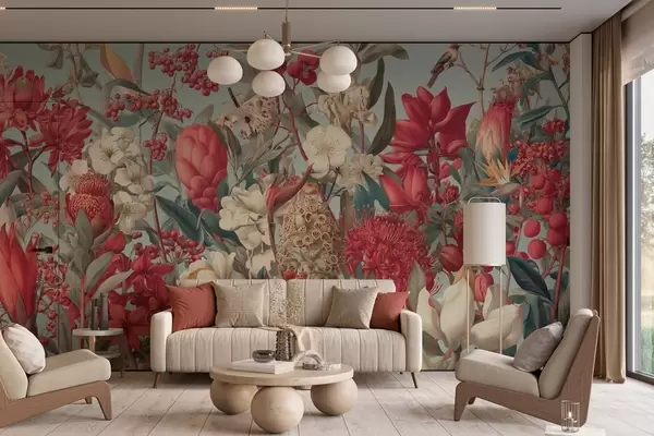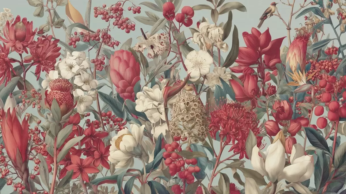 textured tropical flowers on a blue background - Wall mural (No. w04209)
