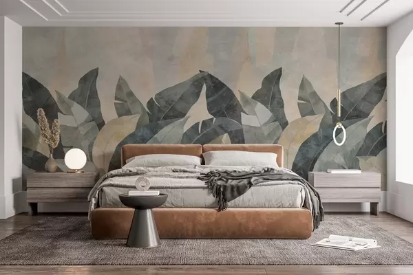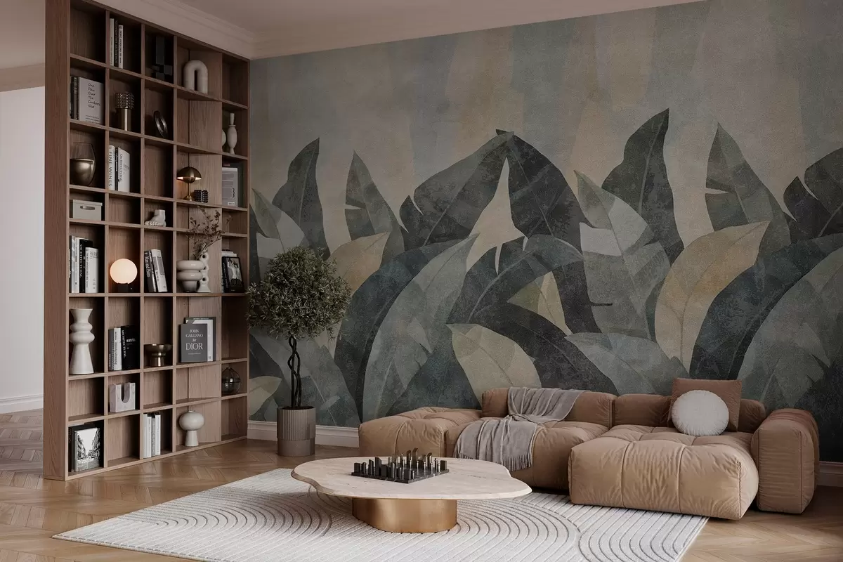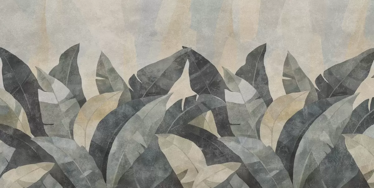 textured banana leaves in natural shades of beige, green and gray - Wall mural (No. w04285)
