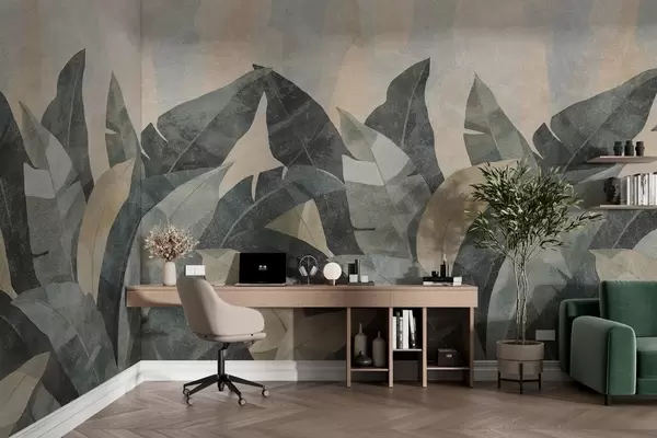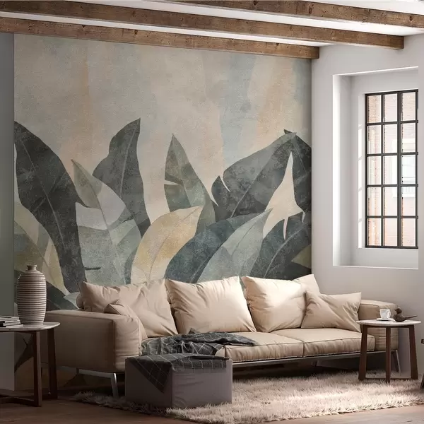 textured banana leaves in natural shades of beige, green and gray - Wall mural (No. w04285)