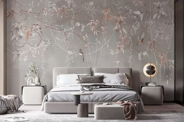 Branches with grapes and birds on warm gray-pink background - Wall mural (No. w04302)