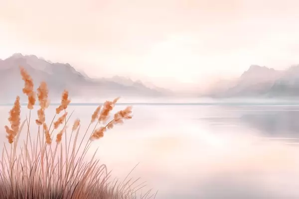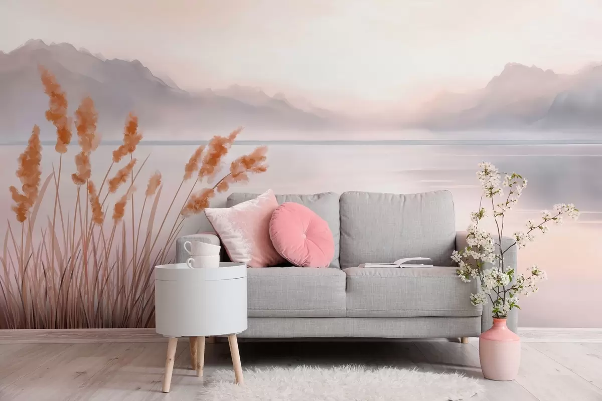 a picturesque lake with reeds and mountains - Wall mural (No. w04315)