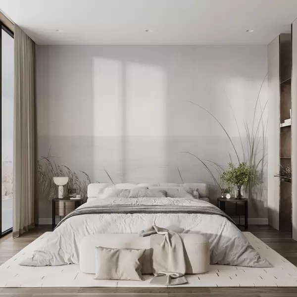 Misty shore with delicate grasses in the foreground - Wall mural (No. w04339)
