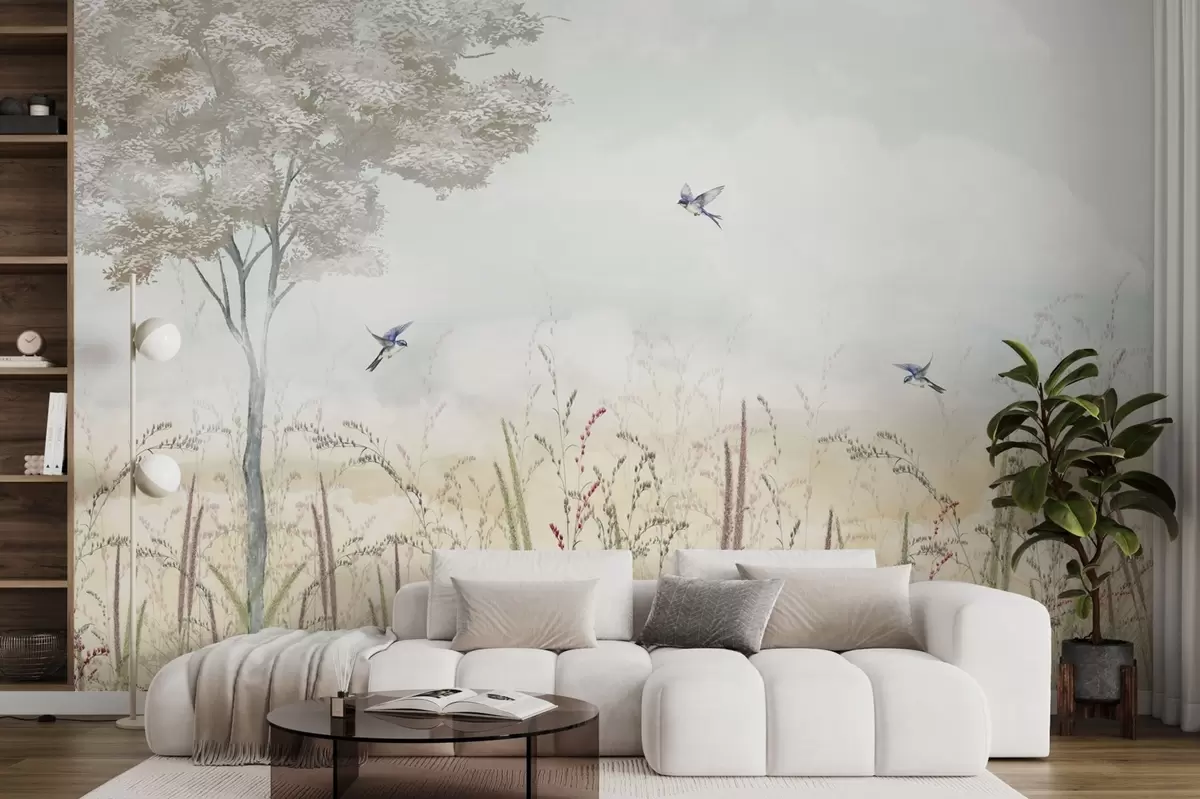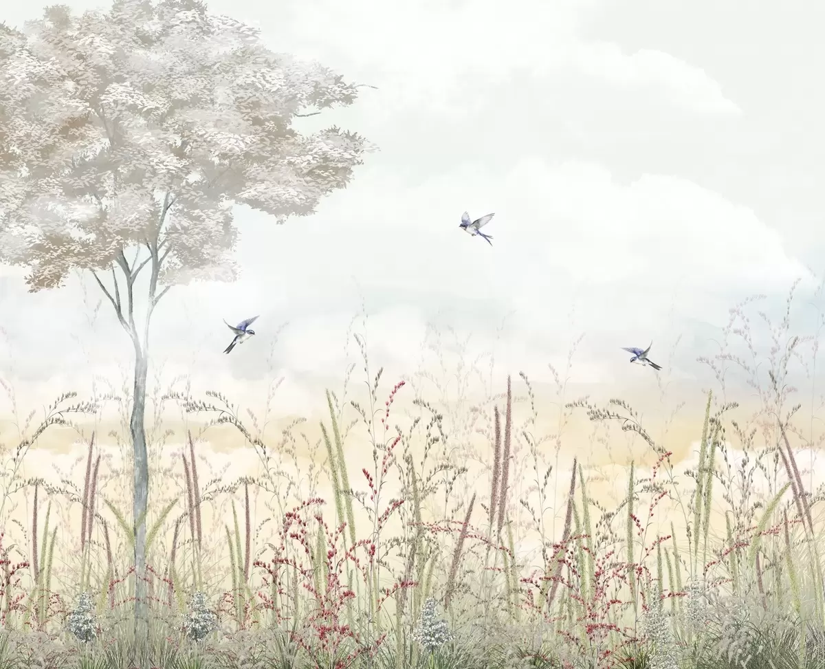 Landscape with tree, birds and meadow grasses - Wall mural (No. w04350)
