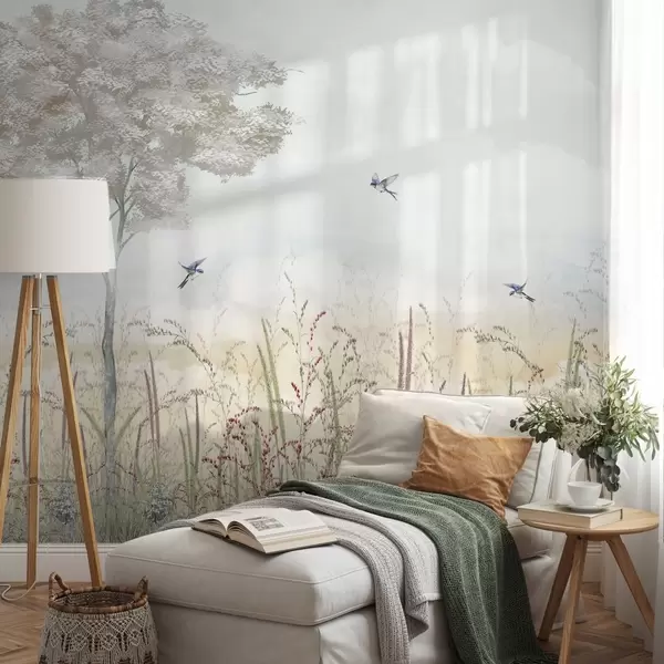 Landscape with tree, birds and meadow grasses - Wall mural (No. w04350)