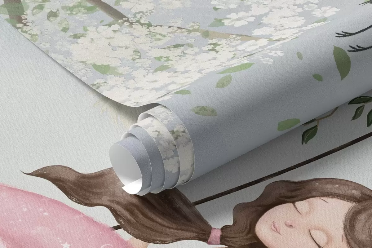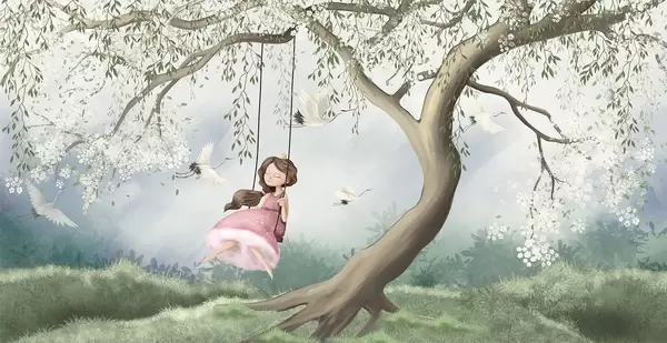 Girl on swing under blooming tree with birds flying around - Wall mural (No. w04370)