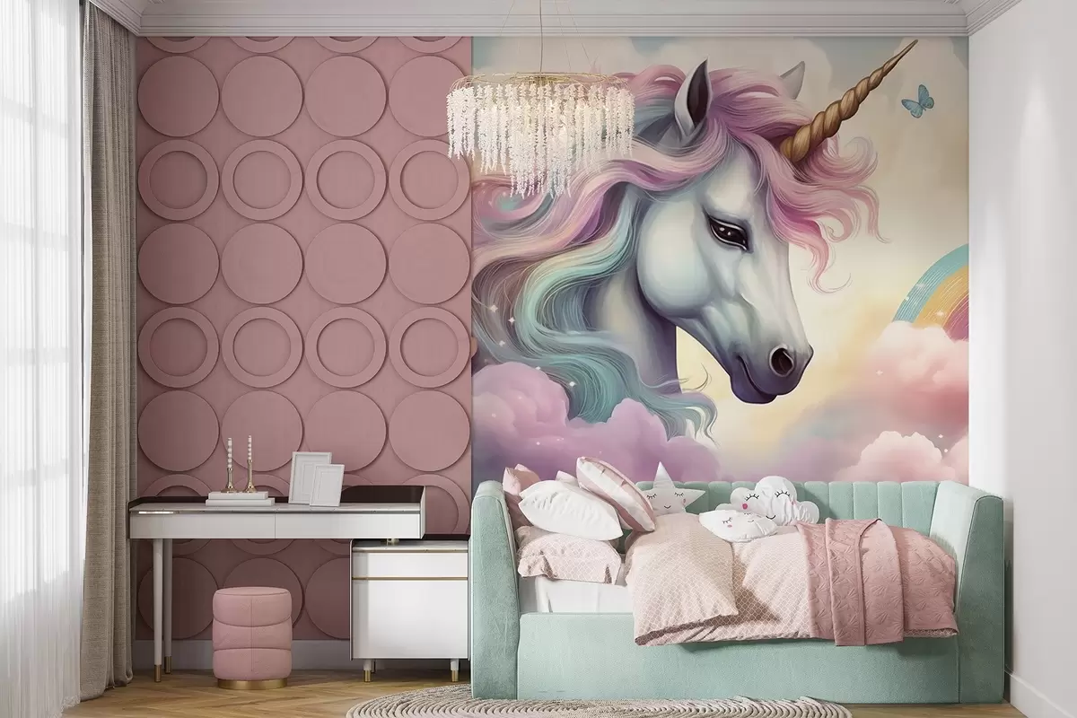 Unicorn in a cloudy sky with a rainbow - Wall mural (No. w04372)