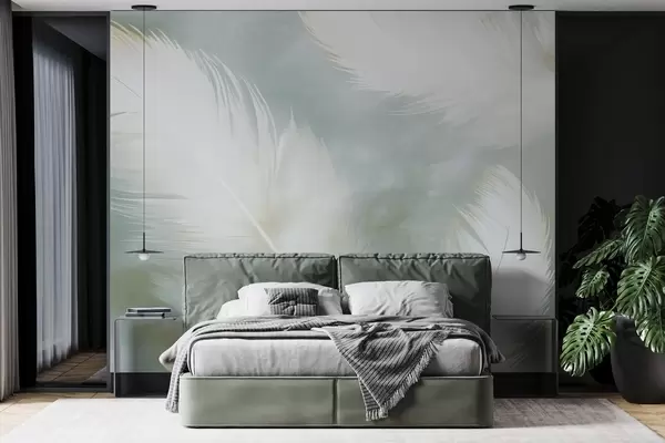 Delicate white feathers on a soft mint background - Wall mural (No. w04399)