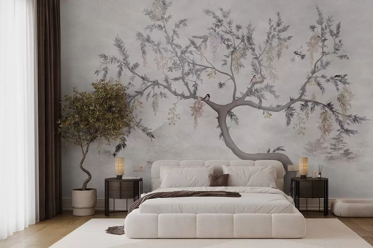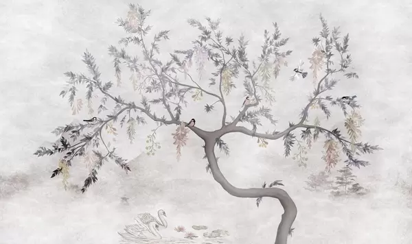 Tree branch with birds in oriental style - Wall mural (No. w04456)