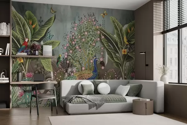 Bright tropical birds and peacock among exotic plants - Wall mural (No. w04457)