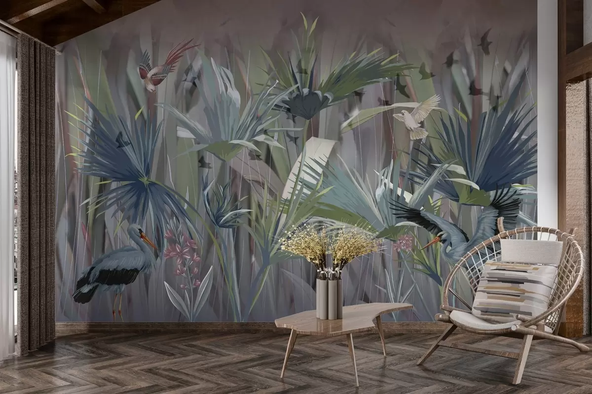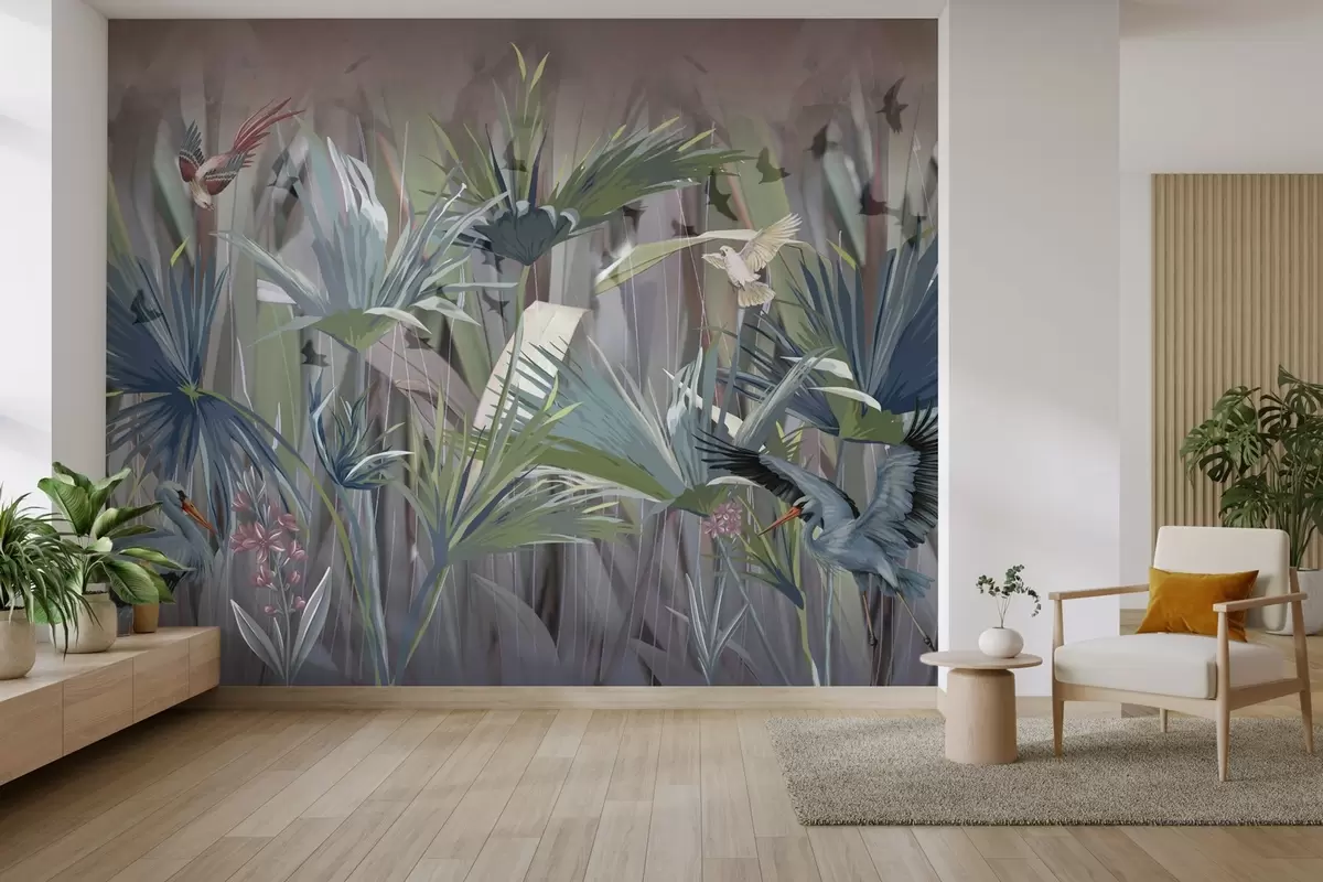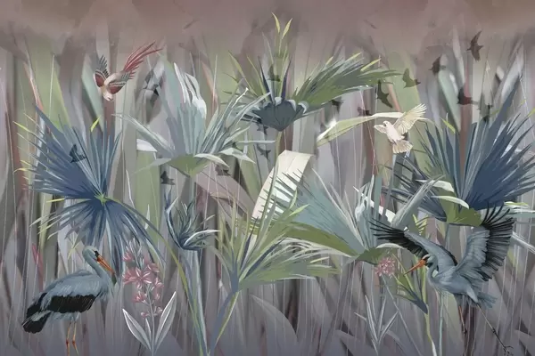 Exotic birds among palm leaves and flowers - Wall mural (No. w04458)