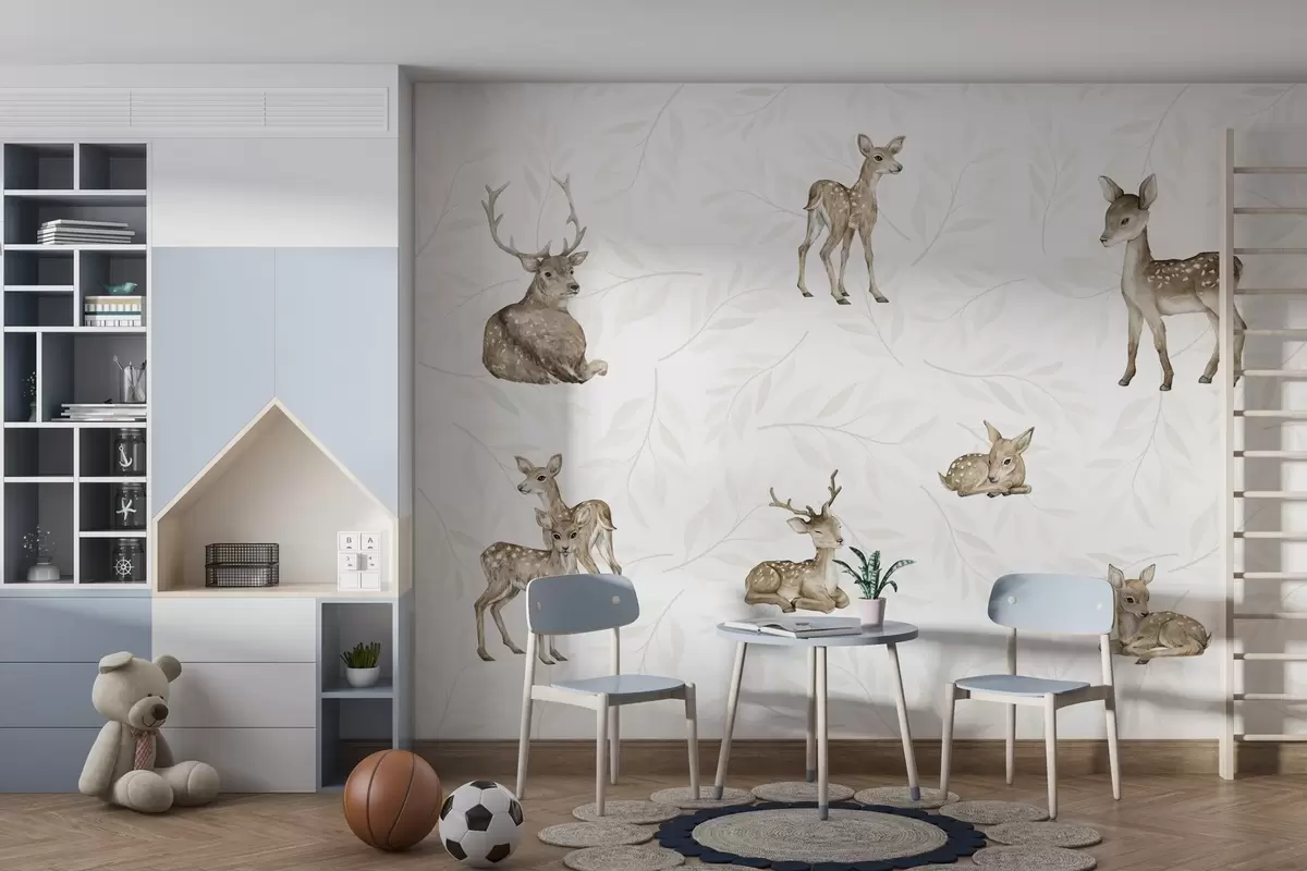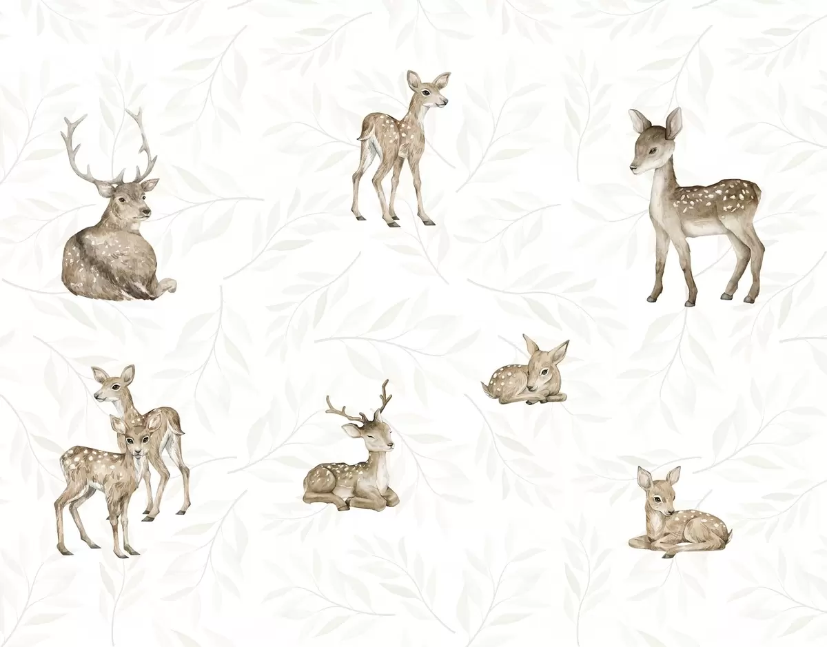 Cute fawns on a light background with twigs - Wall mural (No. w04461)