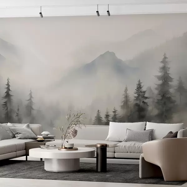 Forest in the fog against the backdrop of mountains - Wall mural (No. w04493)