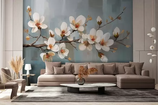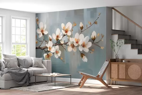 A blossoming branch in the style of oil painting on a blue background - Wall mural (No. w04496)