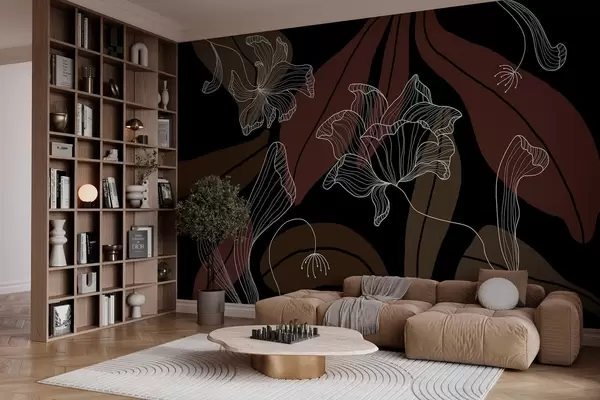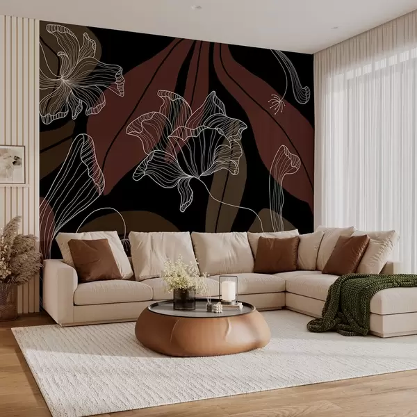 abstract leaves and flowers in powdery and beige tones on a dark background - Wall mural (No. w04499v3)