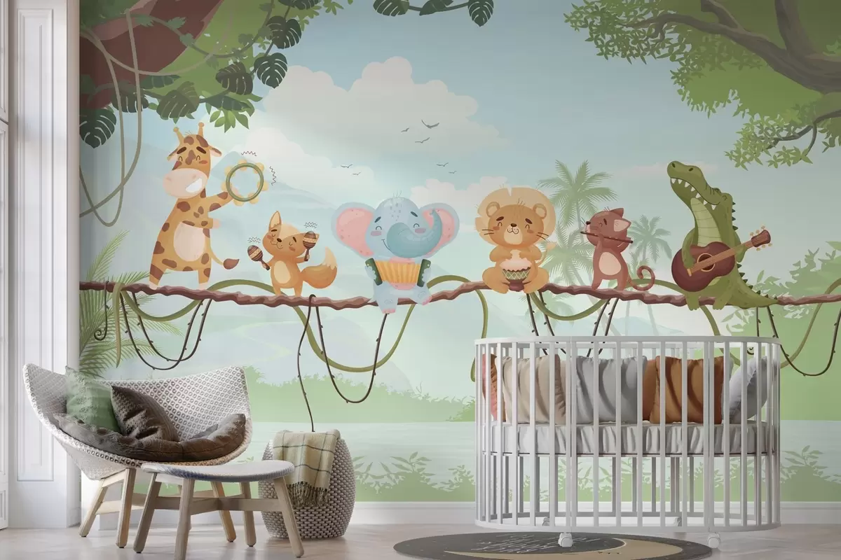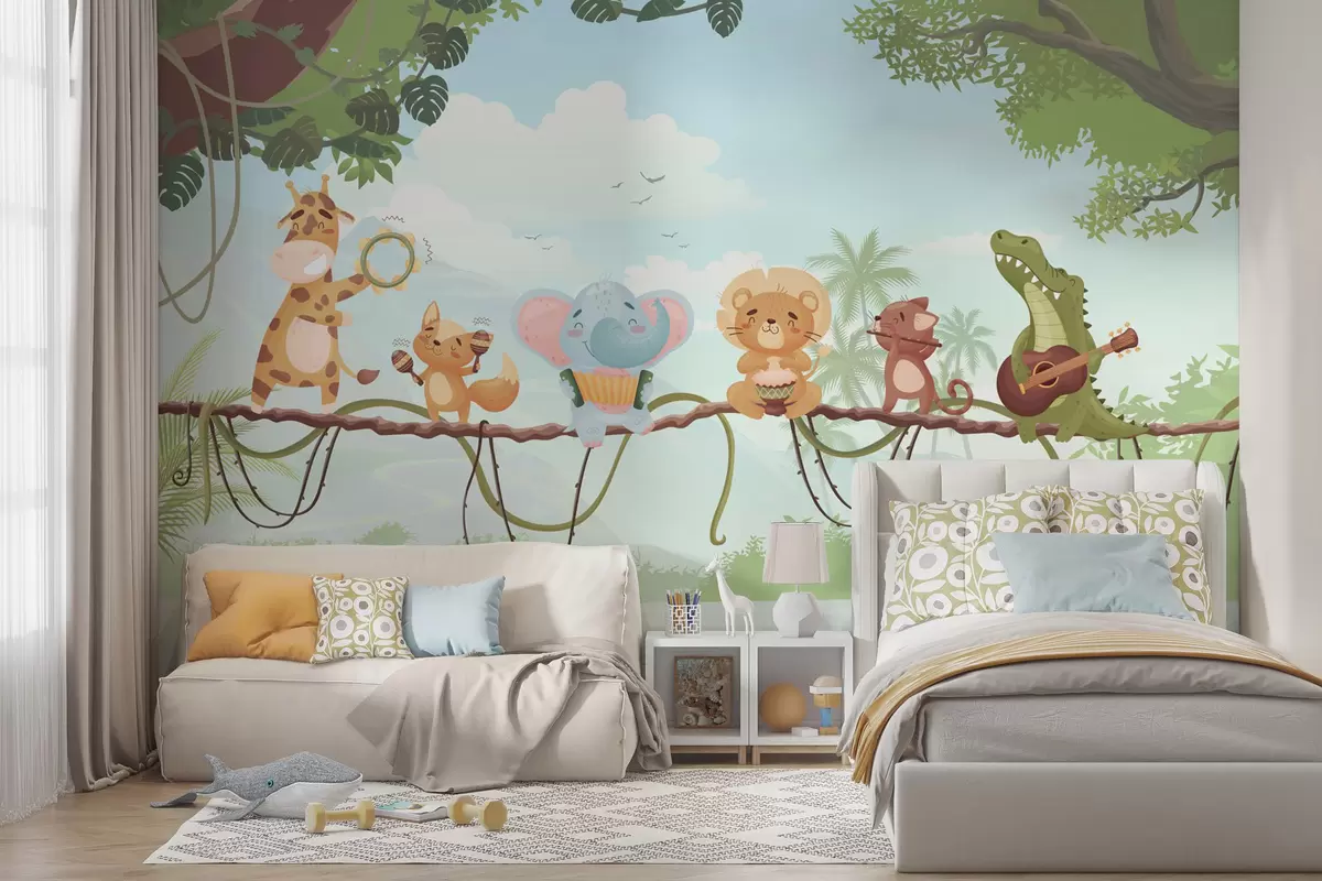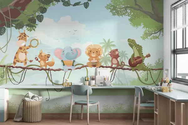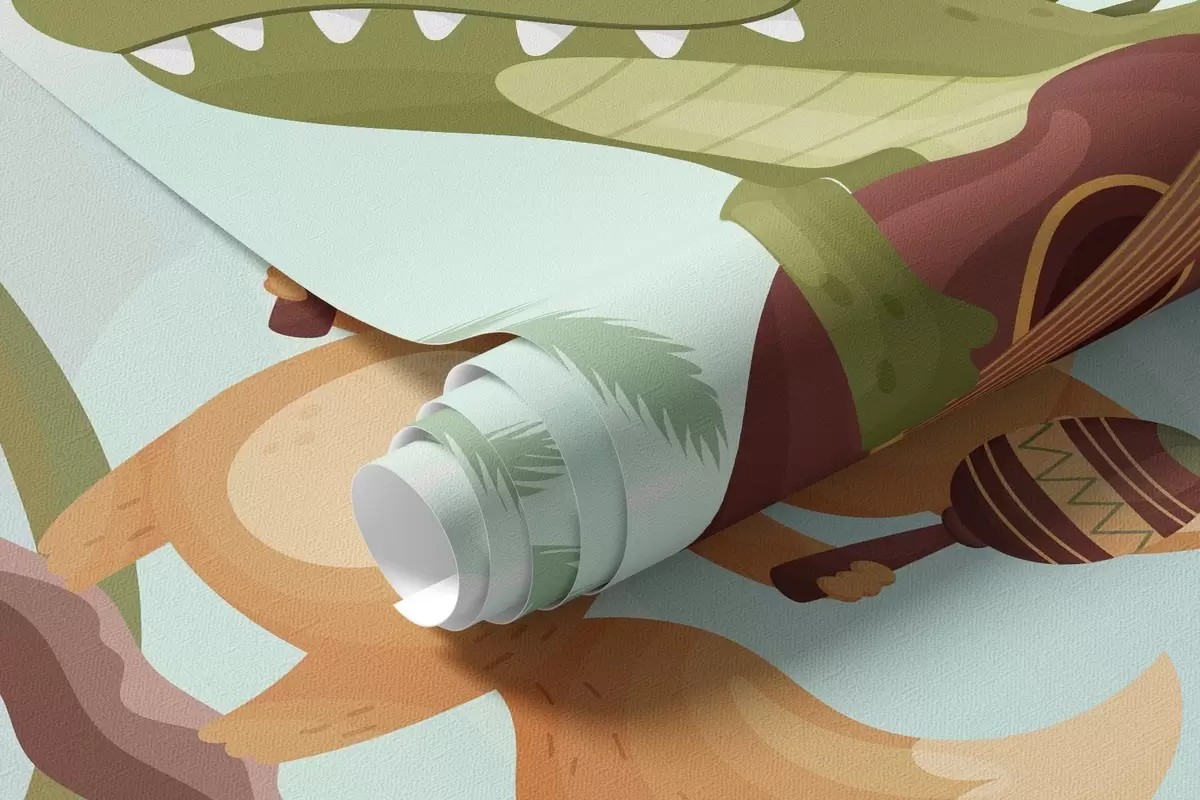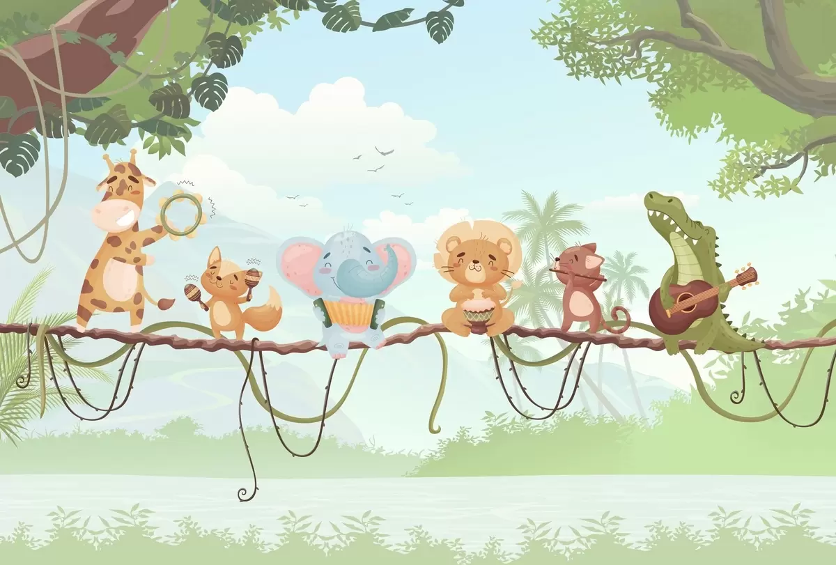 Animals with musical instruments against a tropical landscape - Wall mural (No. w04505)
