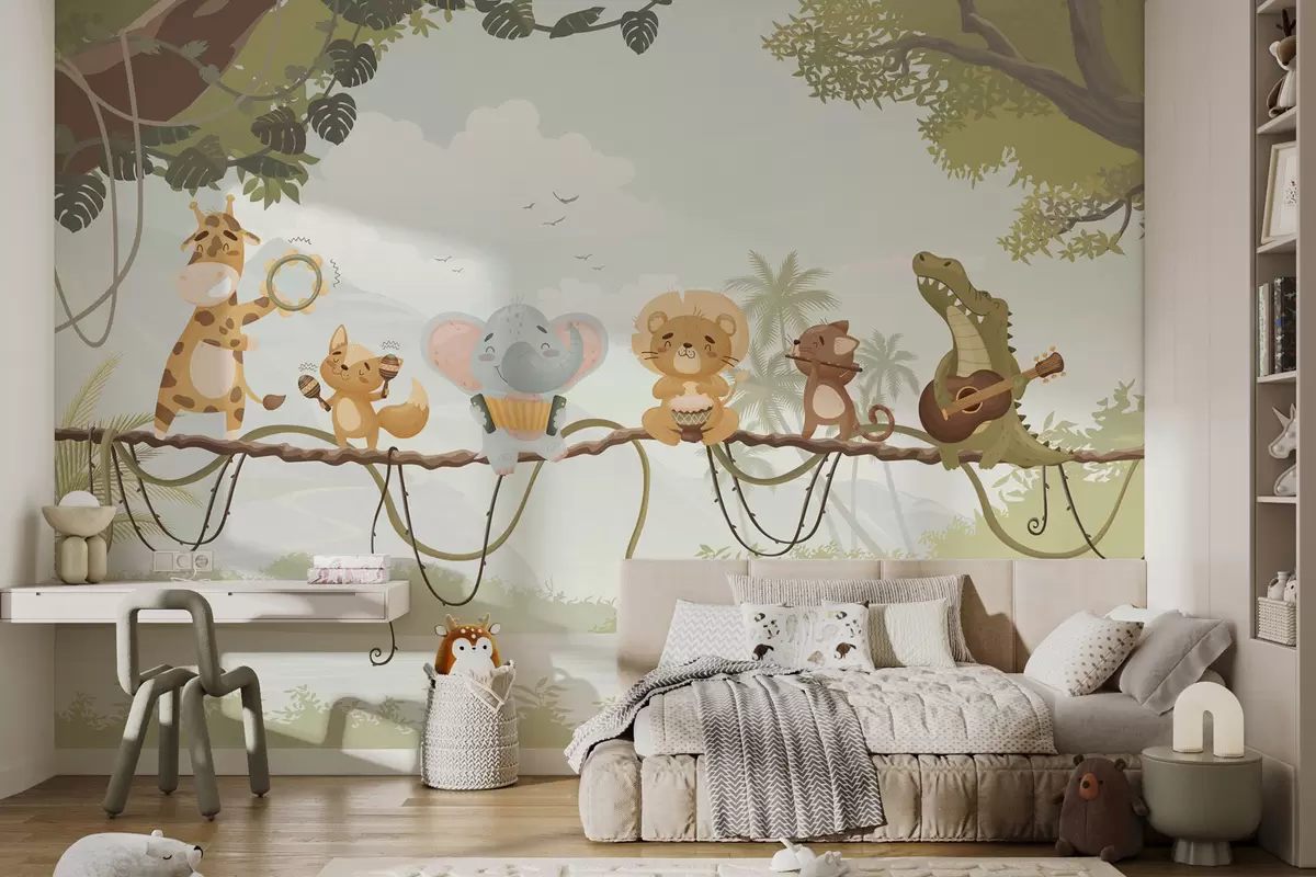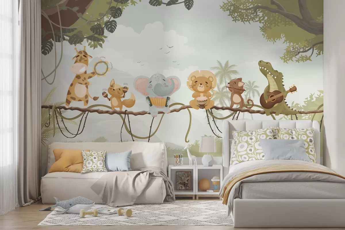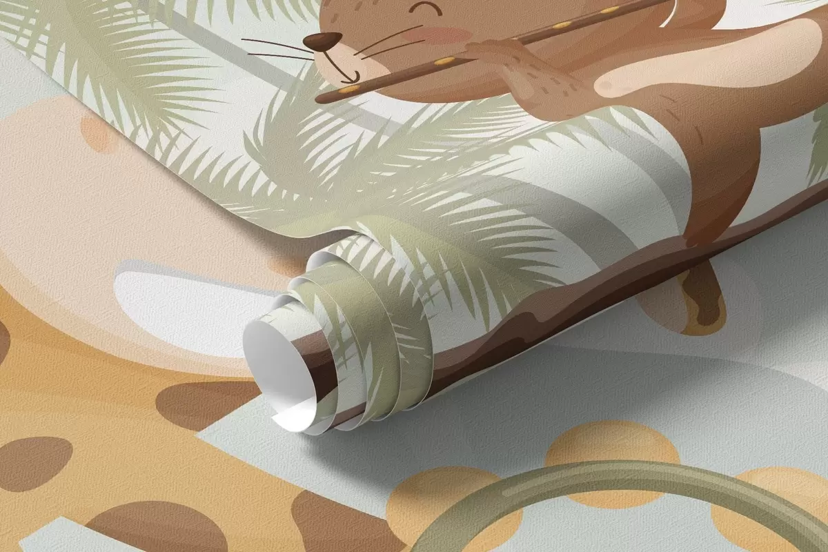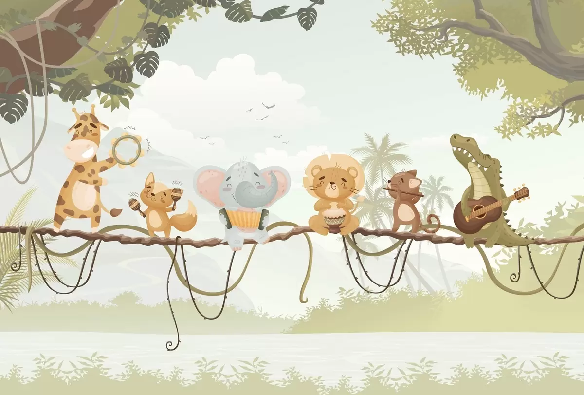 Animals with musical instruments against a tropical landscape - Wall mural (No. w04505v1)