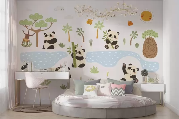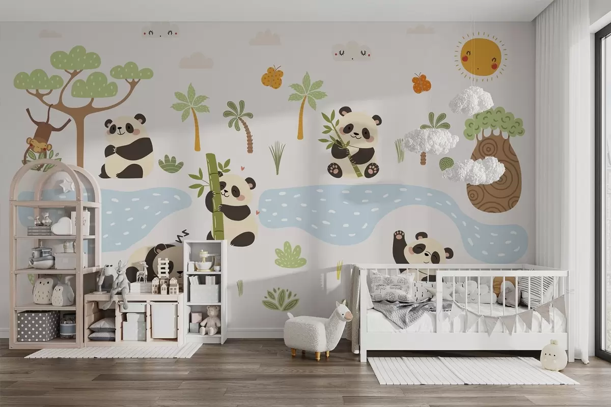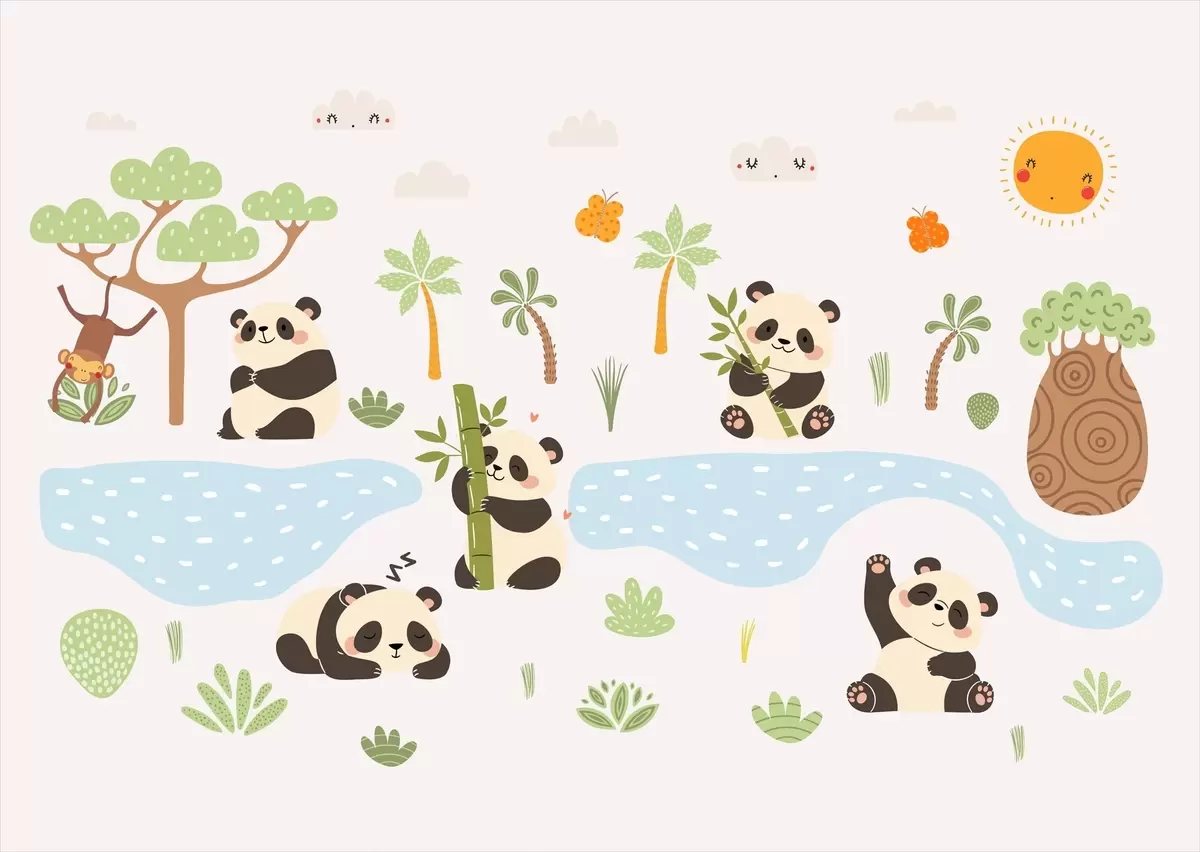 Cheerful pandas by the river - Wall mural (No. w04541)