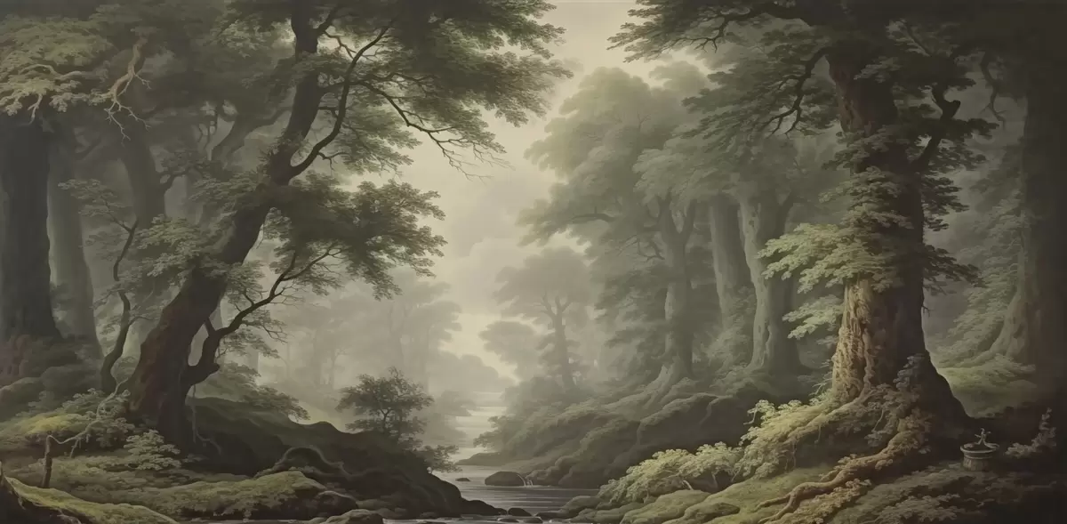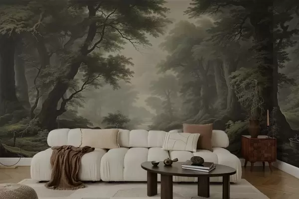 Misty forest with river and tall ancient trees - Wall mural (No. w04555)