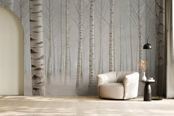 Birch forest in the fog, light minimalism - Wall mural (No. w04574)