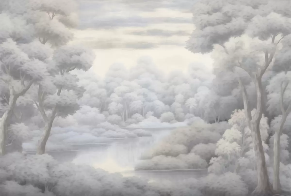 Misty forest and lake in soft gray tones - Wall mural (No. w04617)