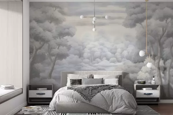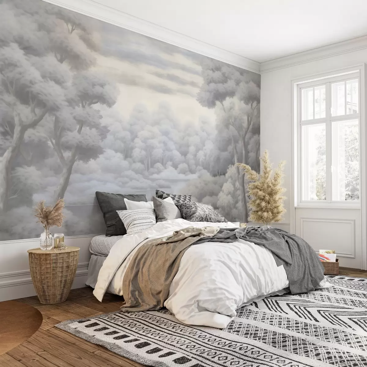 Misty forest and lake in soft gray tones - Wall mural (No. w04617)