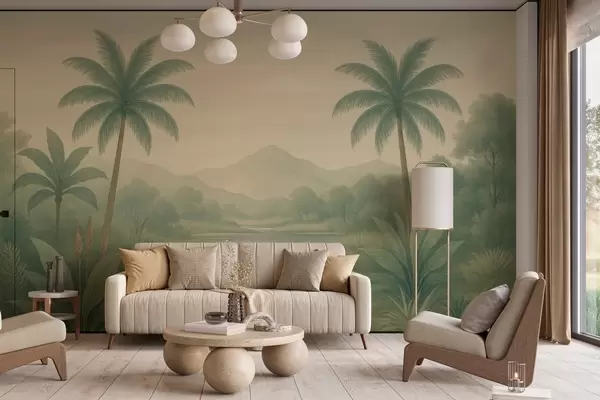 tropical landscape with palm trees and a river - Wall mural (No. w04623)