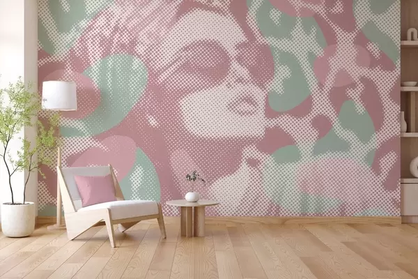 portrait of a woman on a leopard background in a dotted style in pink and green tones - Wall mural (No. w04630v2)