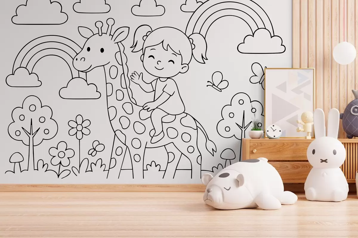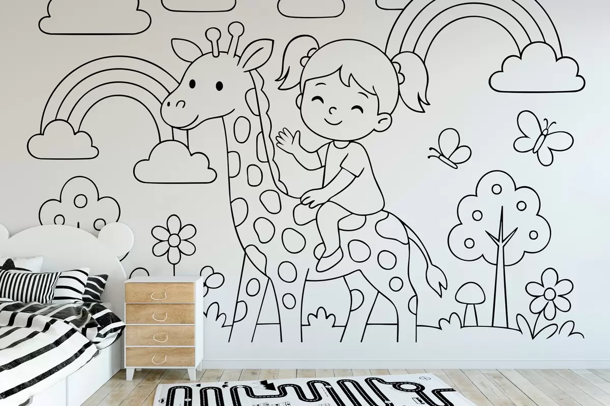 black and white drawing of a girl on a giraffe in the style of a children's colouring book - Wall mural (No. w04753)