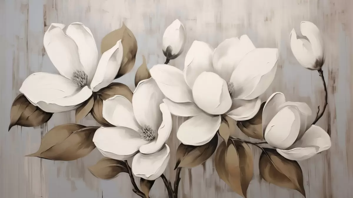 Large magnolia blossoms with taupe leaves on brushed backdrop - Wall mural (No. w04785)