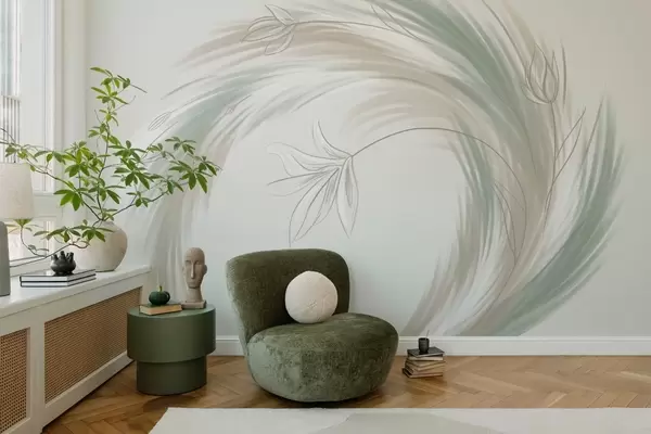 wall murals green and beige feathers and flowers, hand-painted w04816